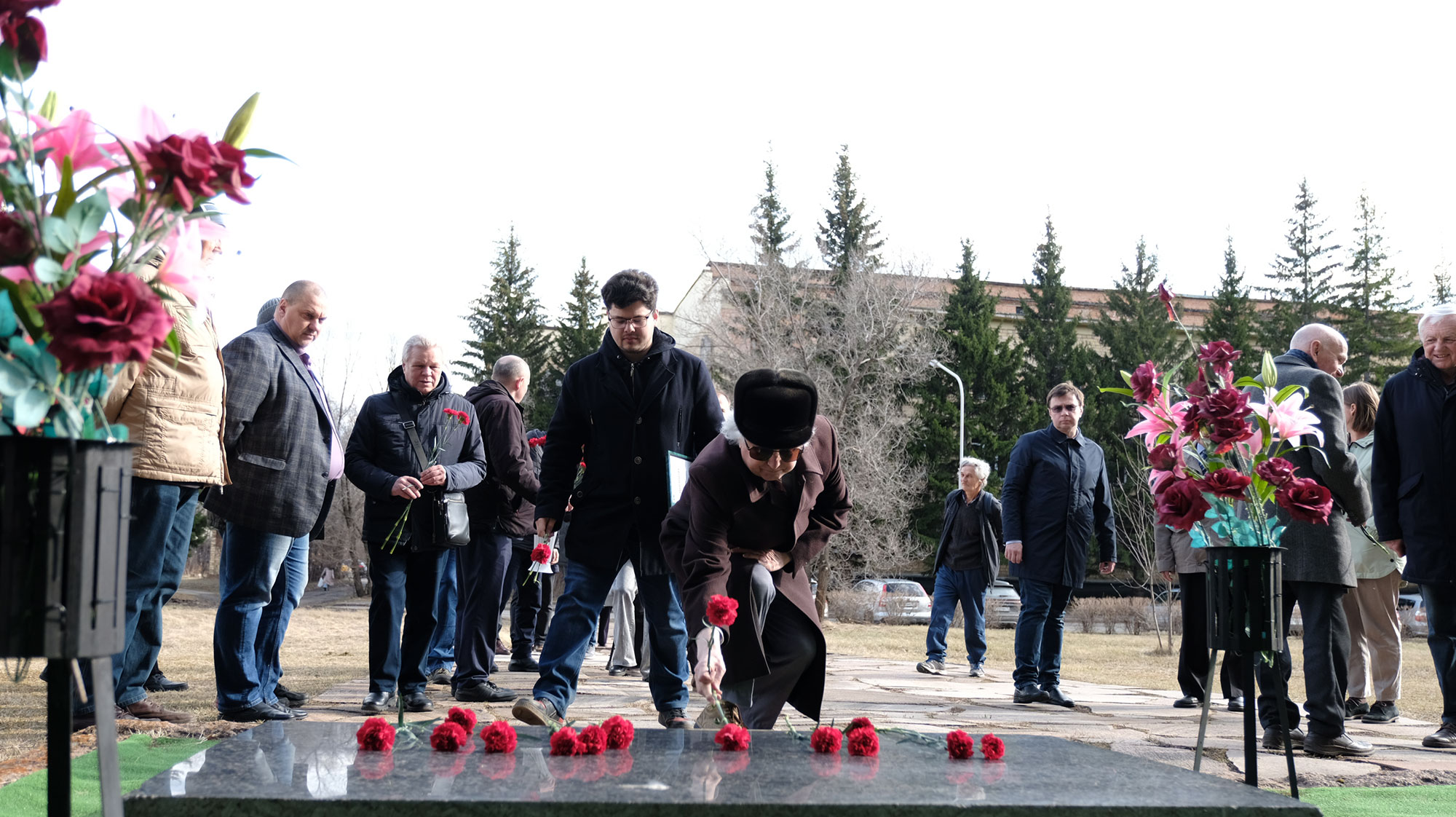 В конференц-зале Института физики им. Л.В. Киренского Сибирского отделения Российской академии наук (ИФ СО РАН) ежегодно в день рождения академика Леонида Васильевича Киренского, организатора и первого директора института проходят научные чтения на расширенном заседание ученого Совета, посвященного его памяти. В 2025 году исполнилось 116 лет со дня рождения академика. По окончанию ученого Совета традиционно возлагаются цветы на могилу Леонида Васильевича. Он похоронен на территории института, носящего его имя в Академгородке Красноярска. На снимке, слева направо: С.Г. Овчинников, заведующий лабораторией физики магнитных явлений, возлагает цветы; М.М. Коршунов, член-корреспондент СО РАН, главный научный сотрудник лаборатории физики магнитных явлений; далее А.И. Панкрац, ведущий научный сотрудник лаборатории резонансных свойств магнитоупорядоченных веществ; И.Н. Флёров, главный научный сотрудник лаборатории кристаллофизики и академик В.Ф. Шабанов. 7 апреля 2025 года.