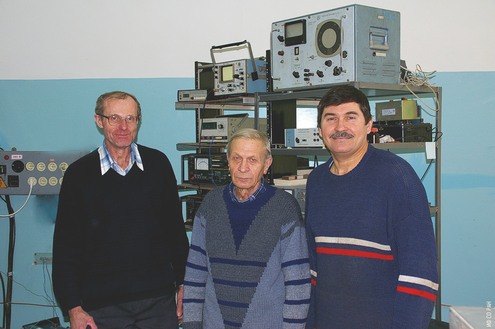 Группа по изучению магнитных свойств жидких кристаллов лаборатории сильных магнитных полей Института физики им. Л.В. Киренского Сибирского отделения Российской академии наук (ИФ СО РАН), за установкой для исследования магнито-оптических свойств жидких кристаллов,. Слева направо: Паршин Александр Михайлович , Садовский Анатолий Михайлович, Томулевич Юрий Викторович, фото 2006 года. Красноярск.