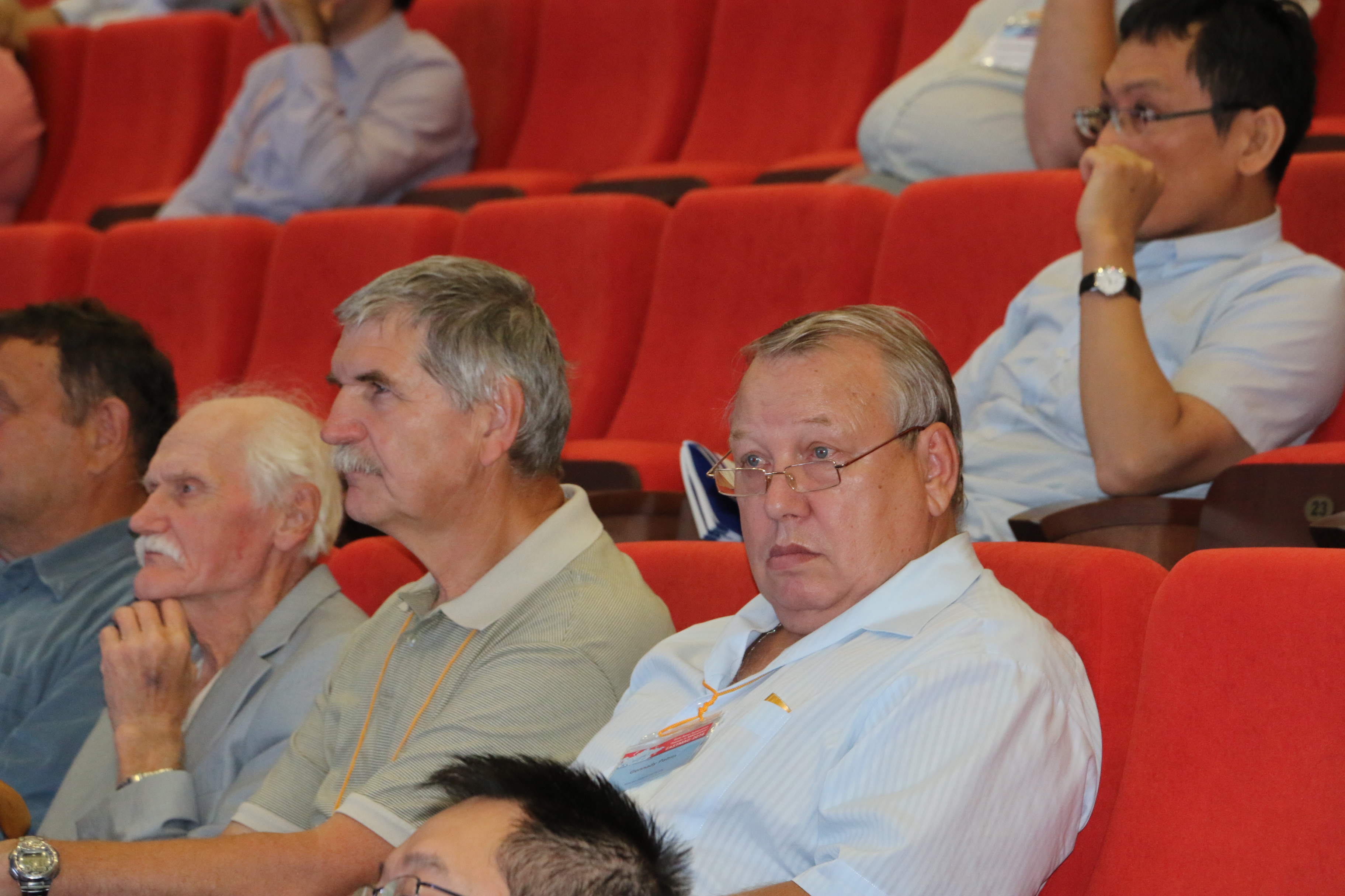 Открытие Евро-Азиатского симпозиума "Прогресс в магнетизме" (EASTMAG-2016) в конгресс-холле Сибирского федерального университета (СФУ) Красноярска. 15 августа 2016 года. Во втором ряду крайний справа Патрин Геннадий Семенович, заведующий лабораторией магнитодинамики Института физики им. Л.В. Киренского Сибирского отделения Российской академии наук (ИФ СО РАН), председатель локального Оргкомитета симпозиума. Третий справа - Турпанов Игорь Александрович, старший научный сотрудник лаборатории магнитодинамики ИФ СО РАН.