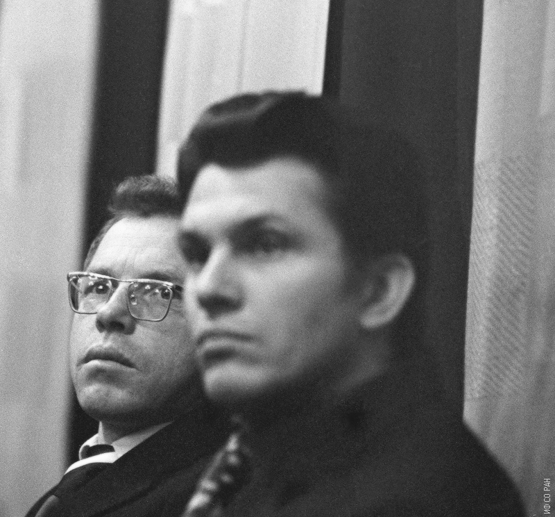 1976 год. Петроченко Михаил Прокопьевич (слева), ведущий инженер бюро контрольно-измерительных приборов и Самойлов Владимир Александрович, руководитель бюро контрольно-измерительных приборов Института физики им. Л.В. Киренского Сибирского отделения Академии наук СССР (ИФ СО АН СССР), на торжественном заседании в честь 20-летия института.