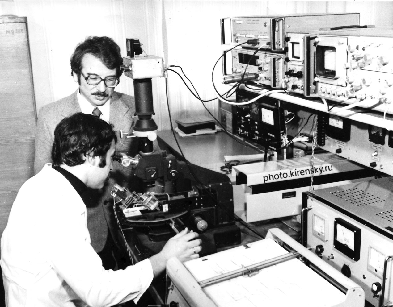 Фролов Георгий Иванович (слева) и Рейнгард Александр Ефремович, сотрудники лаборатории физики магнитных пленок Института физики им. Л.В. Киренского Сибирского отделения Академии наук СССР (ИФ СО АН СССР), за обсуждением результатов эксперимента, снимок 1990 года. Красноярск.