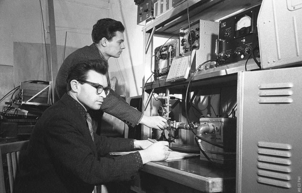 Тушков Б. П. (слева) и Русов Г. И. за работой на установке, разработанной и созданной Тушковым Б.П. в 1966 году в лаборатории физики магнитных явлений Института физики Сибирского отделения Академии наук СССР (заведующий лабораторией Л. В. Киренский). Установка позволяла проводить измерения составляющих комплексной СВЧ восприимчивости.