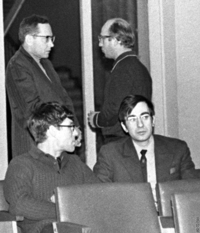 В перерыве общеинститутского физического семинара в конференц-зале Института физики им. Л.В. Киренского Сибирского отделения Академии наук СССР (ИФ СО АН СССР). В проеме двери Александров К.С. (слева) и Рябинкин Л. Н., сидят: ?, и Лившиц А. И (справа), фото 1973 года. Красноярск.