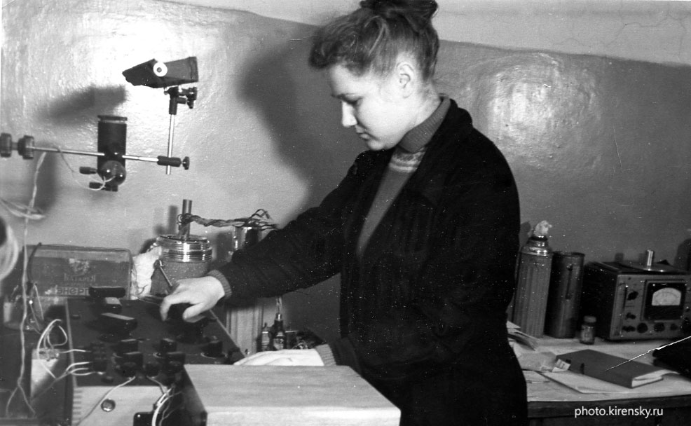 1964 год. На снимке Л.И. Рябинкина, младший научный сотрудник лаборатории магнитных материалов Института физики Сибирского отделения Академии наук СССР (ИФ СО АН СССР), за установкой по измерению электросопротивления ферритов мостовым компенсационным методом. Красноярск.
