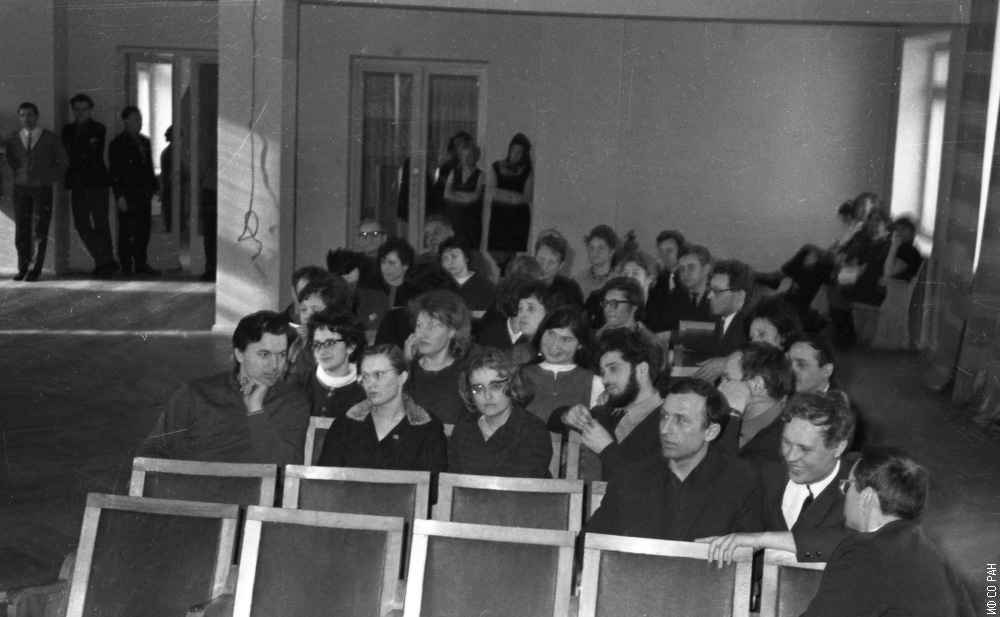 В конференц-зале Института физики им. Л.В. Киренского Сибирского отделения Академии наук СССР (ИФ СО АН СССР), перед началом торжественного заседания, посвященного Международному женскому Дню 8-ое марта. В первом ряду В.В. Спиров. Во втором ряду (слева направо): А.С. Мельник, Б.П. Хрусталев (справа). В третьем ряду (слева направо): В.А. Середкин, Е.А. Хлебопрос, В.А. Елманова , А.М. Фиштейн, А.И. Польский. В четвертом ряду (слева направо): Л.А. Саланская, З.И. Синегубова, 7 марта 1974 года.