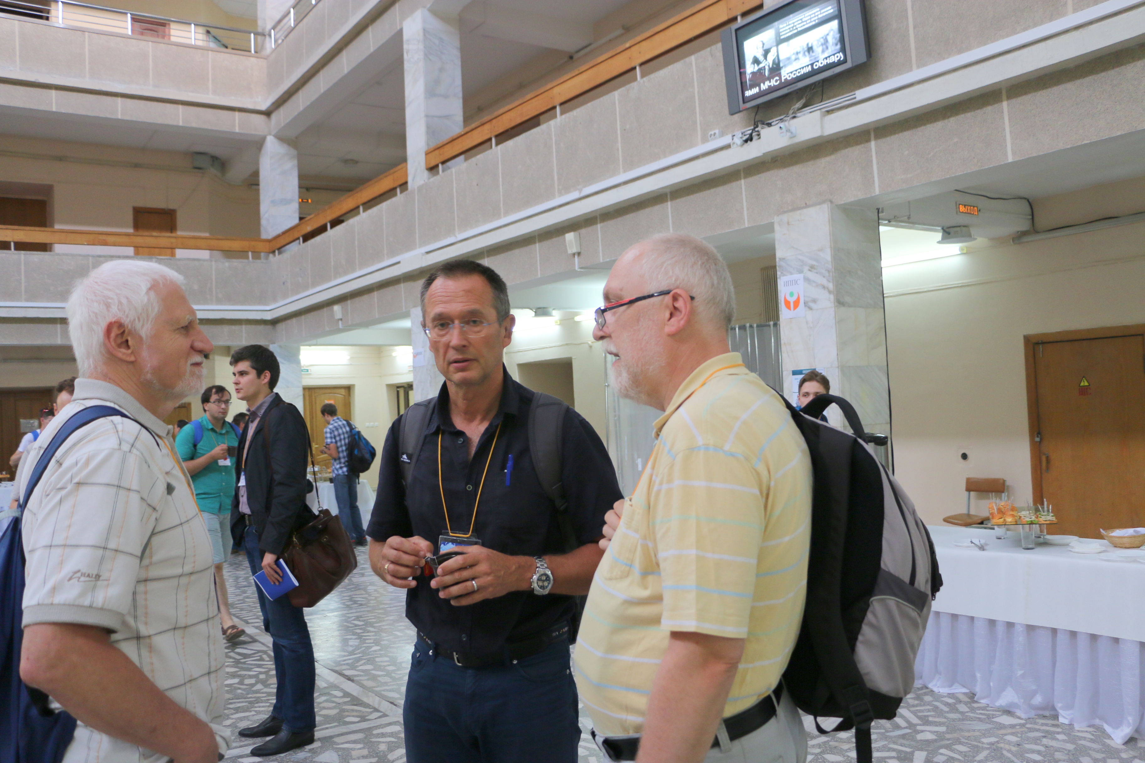 Игорь Семенович Сандалов, старший научный сотрудник лаборатории физики магнитных явлений Института физики им. Л.В. Киренского Сибирского отделения Российской академии наук (ИФ СО РАН) (слева), с физиками из Словении Янезом Бонкой (в центре) и Томашем Мертелжем (Исследовательский институт им. Й. Стефана, Любляна) на Евро-Азиатском симпозиуме "Прогресс в магнетизме" (EASTMAG-2016) в августе 2016 года в Красноярске.