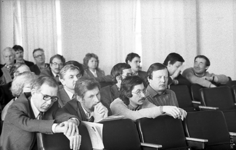 1986 год. Лабораторией резонансных свойств магнитоупорядоченных веществ Института физики им. Л.В. Киренского Сибирского отделения Академии наук СССР в г. Дивногорске (Красноярский край) был организован и проведен семинар по функциональной магнитоэлектронике. На снимке одно из пленарных заседаний. В первом ряду (слева) ученый секретарь института Смокотин Э.М. Во втором ряду (третий слева) - Сандалов И.С., рядом - Овчинников С.Г. В последнем ряду, крайний слева Бабкин Е.В. и Дрокина Т.В., сотрудники Института физики. Дивногорск.