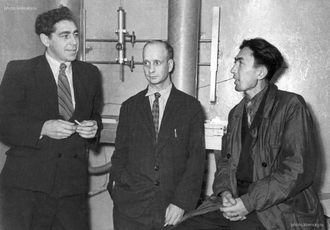 1962 год. Слева направо: В.А. Буравихин (один из первых аспирантов Киренского), Л.В. Киренский (организатор и первый директор Института физики Сибирского отделения Академии наук СССР (ИФ СО АН СССР), М. К. Савченко (один из первых сотрудников института), обсуждают результаты эксперимента по тонким магнитным пленкам. Красноярск.