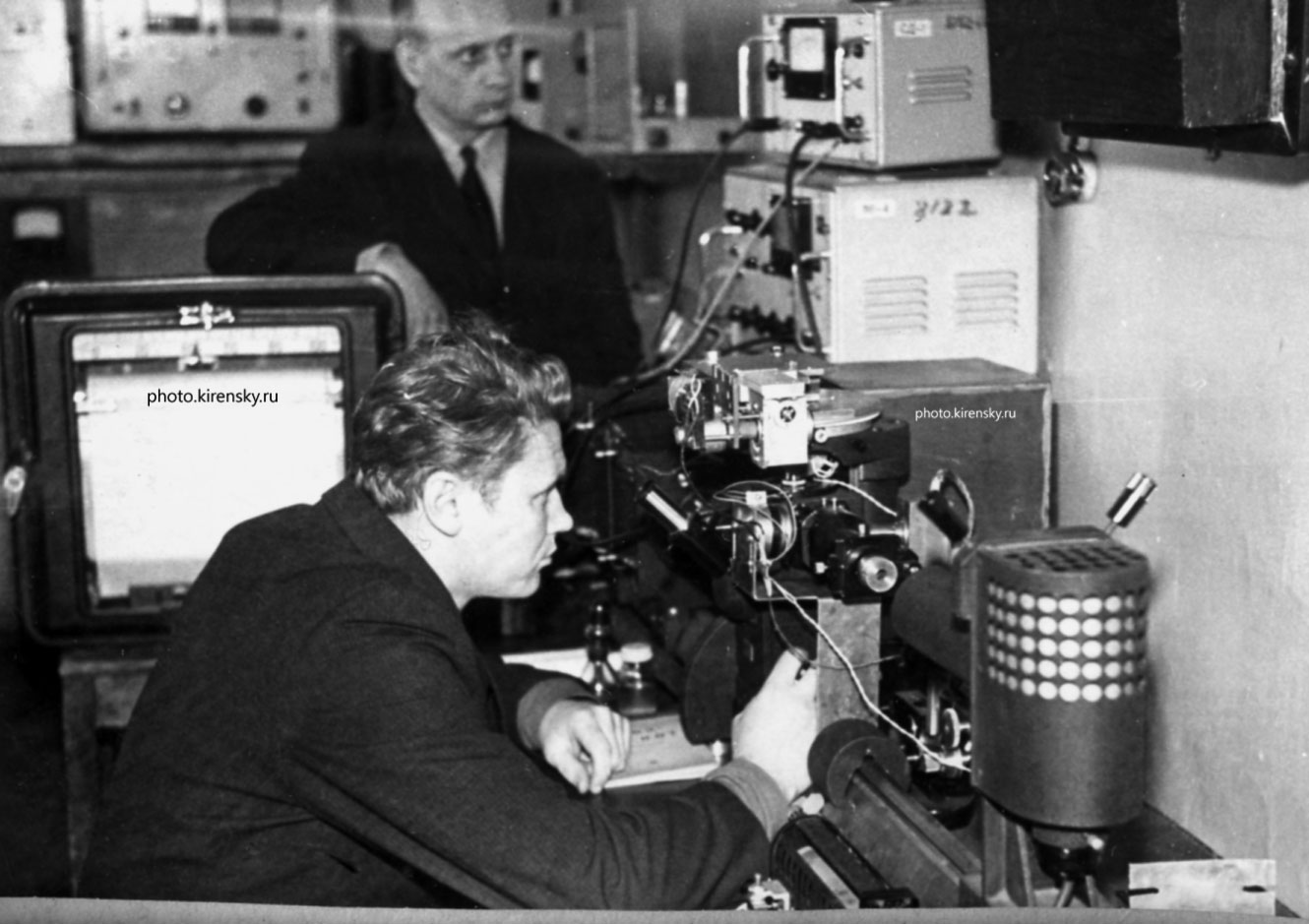 1967 год. Турпанов И.А.(сидит) и Савченко М.К., сотрудники лаборатории физики магнитных явлений (ФМЯ) Института физики Сибирского отделения Академии наук СССР (ИФ СО АН СССР) (СО АН СССР с 1991 года СО РАН), за установкой для регистрации доменных границ магнитооптическими методами. Красноярск.