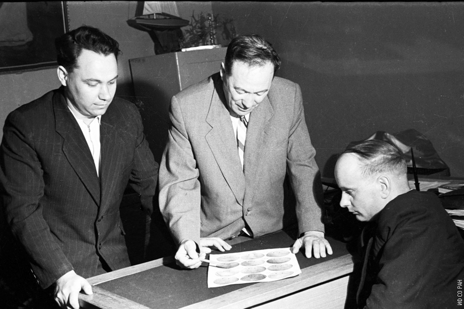 1959 год. На снимке первые сотрудники лаборатории физики магнитных явлений Института физики Сибирского отделения Академии наук СССР (ИФ СО АН СССР). Слева направо: Лаптей Д.А., Савченко М.К., Черкашин В.С. Красноярск.