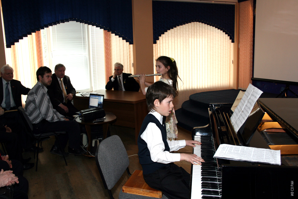 После торжественного заседания, посвященного 100-летию со дня рождения академика Л.В.Киренского, организатора и первого директора Института физики им. Л.В. Киренского Сибирского отделения Российской академии наук (ИФ СО РАН), в Доме ученых Красноярского научного центра СО РАН выступили учащиеся детской музыкальной школы № 11 Академгородка. На снимке: Аня Лысенко (флейта) и Витя Антипов (фортепиано).
