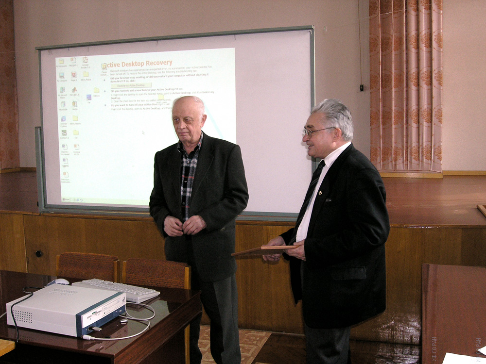 Директор Института физики им. Л.В. Киренского Сибирского отделения Российской академии наук (ИФ СО РАН) академик Шабанов Василий Филиппович (справа) и заведующий лабораторией магнетизма горных пород института Звегинцев Анатолий Георгиевич, на заседании ученого Совета института. Снимок 2005 года. Красноярск.