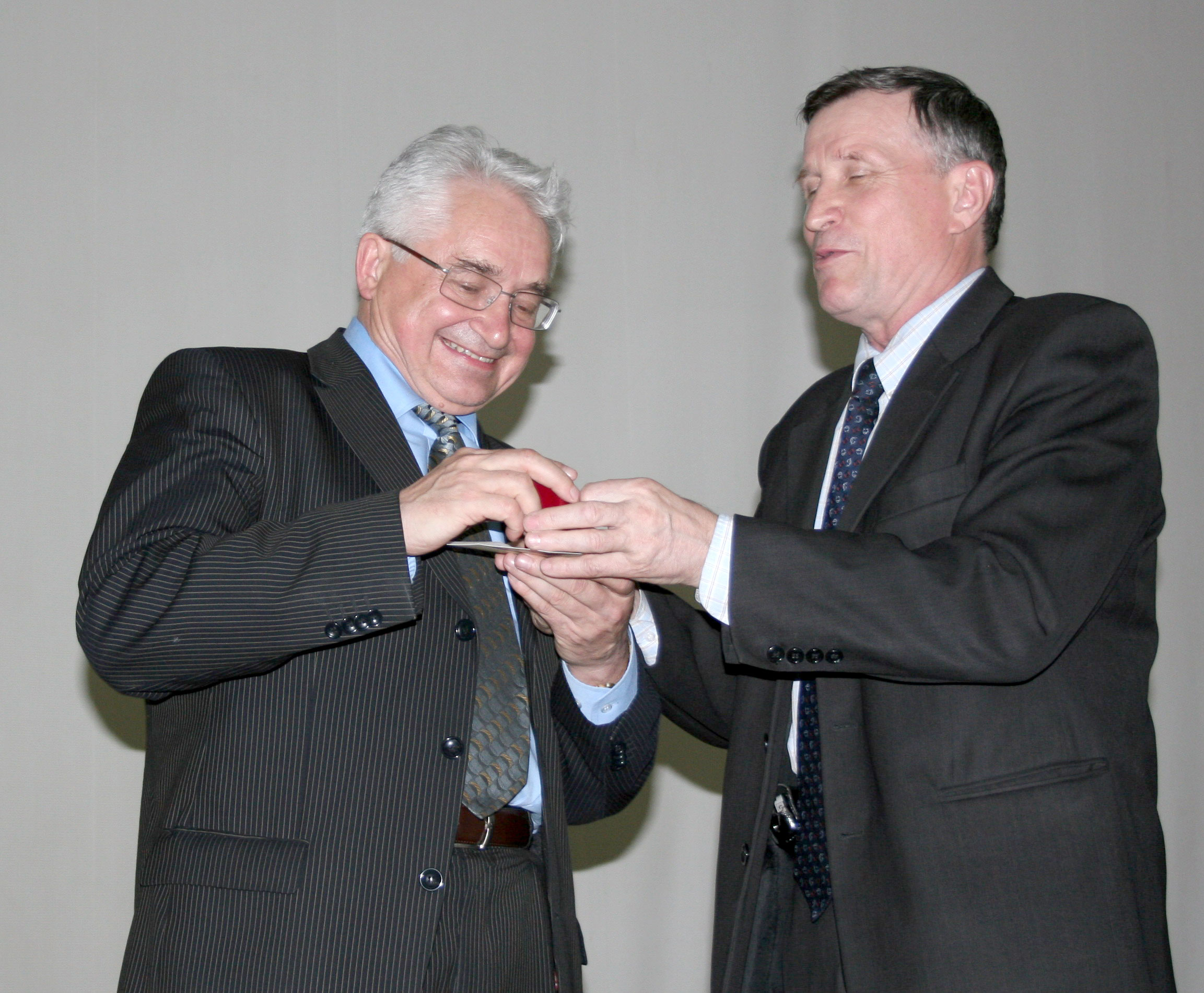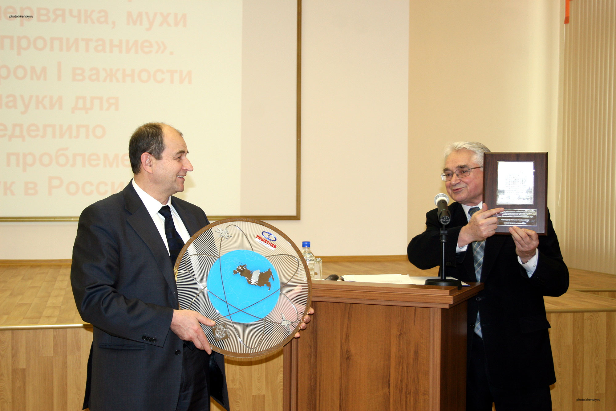 В конференц-зале Красноярского научного центра Сибирского отделения Российской академии наук (КНЦ СО РАН) состоялось торжественное заседание в честь 50-летия СО РАН. Куимов В.В., заместитель мэра Красноярска, вручает академику В.Ф. Шабанову (слева), председателю Президиума КНЦ СО РАН, памятный знак города. 2007 года.