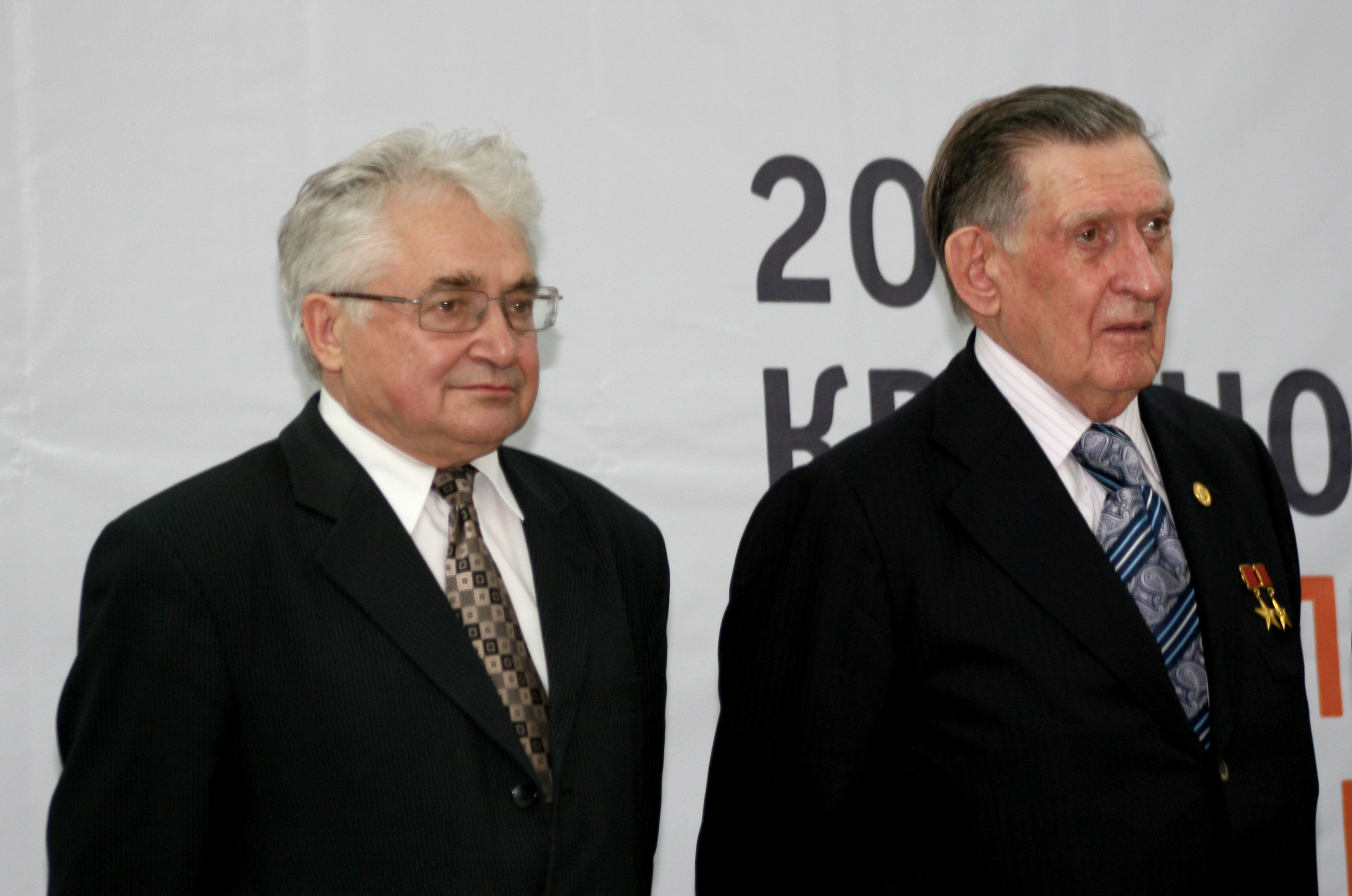 Академик В.Ф. Шабанов, председатель Президиума Красноярского научного центра Сибирского отделения Российской академии наук (КНЦ СО РАН), Долгих Владимир Иванович (справа) на Красноярском инновационном форуме. 2009 год.