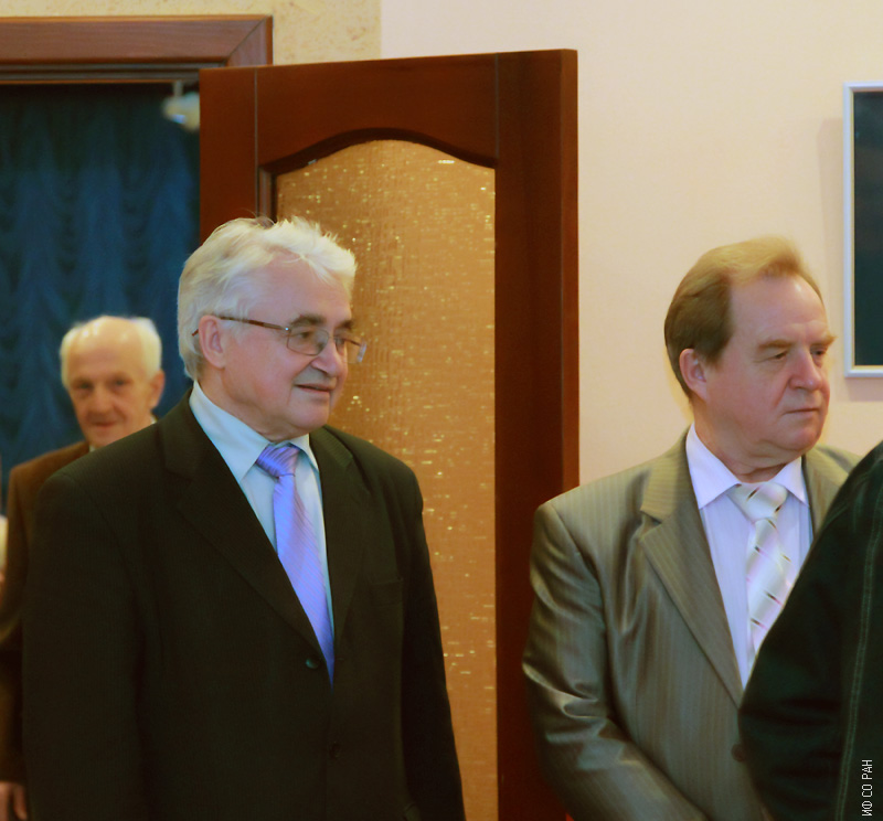 Январь 2011 года. Академик В.Ф. Шабанов (слева), председатель Президиума Красноярского научного центра Российской академии наук (КНЦ СО РАН), директор Института физики им. Л.В. Киренского СО РАН и П.Г. Шкуряев, главный ученый секретарь Красноярского научного центра СО РАН, на торжественном заседании, посвященном 100-летию А.В. Коршунова. Красноярск. Академгородок. Дом ученых.