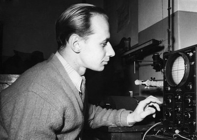 Смолин Роберт Павлович, младший научный сотрудник лаборатории физики магнитных явлений Института физики Сибирского отделения Академии наук СССР (ИФ СО АН СССР), за установкой по изучению магнитных свойств ферритов, фото 1962 года. Красноярск.