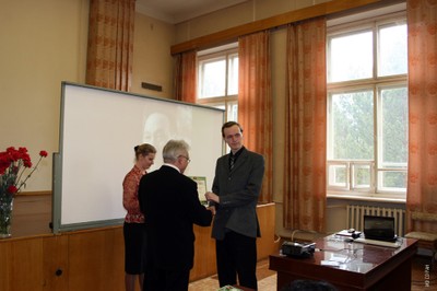 Директор Института физики им. Л.В. Киренского Сибирского отделения Российской академии наук (ИФ СО РАН) академик В.Ф.Шабанов вручает почетную грамоту победителю ежегодного конкурса-конференции молодых ученых Красноярского научного центра СО РАН (в 2009 году посвященного 100-летию Киренского). Слева от Шабанова С.Н. Сафронова. Красноярск.