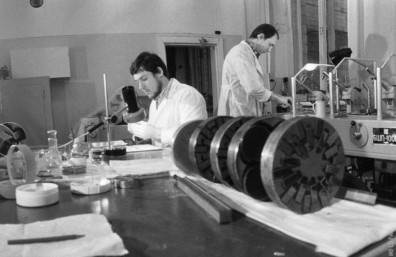 1982 год. Свентитский Владимир Михайлович (слева) и Примаков Сергей Александрович, сотрудники оптического участка экспериментальных механических мастерских Института физики им. Л.В. Киренского Сибирского отделения Академии наук СССР (ИФ СО АН СССР). Красноярск.