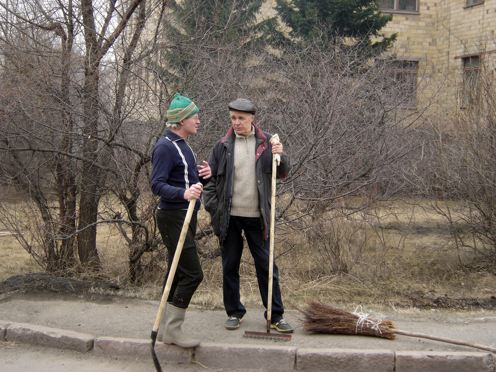 Сотрудники лаборатории кристаллофизики Института физики им. Л.В. Киренского Сибирского отделения Российской академии наук (ИФ СО РАН) Сысоев (слева) и Чижиков В.А. на традиционном весеннем субботнике по уборке территории института 12 мая 2006 года. Красноярск.
