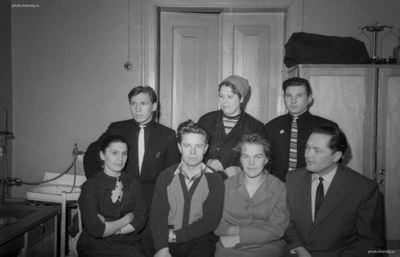 Сотрудники отдела биофизики Института физики Сибирского отделения Академии наук СССР сидят (слева направо): Рябцева А.А. Трубачёв И.Н., Балуева Г.Р. Стоят ?, Морева Г.Е., ?. Фото 1961 года.
