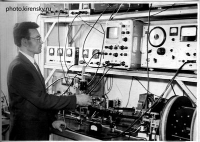 1967 год. На снимке Борис Платонович Тушков. Им разработана и создана чувствительная установка, позволяющая проводить измерения составляющих комплексной СВЧ-восприимчивости тонких ферромагнитных пленок в слабых магнитных полях. Установка была создана в лаборатории магнитных явлений Института физики Сибирского отделения Академии наук СССР (ИФ СО АН СССР). Красноярск.