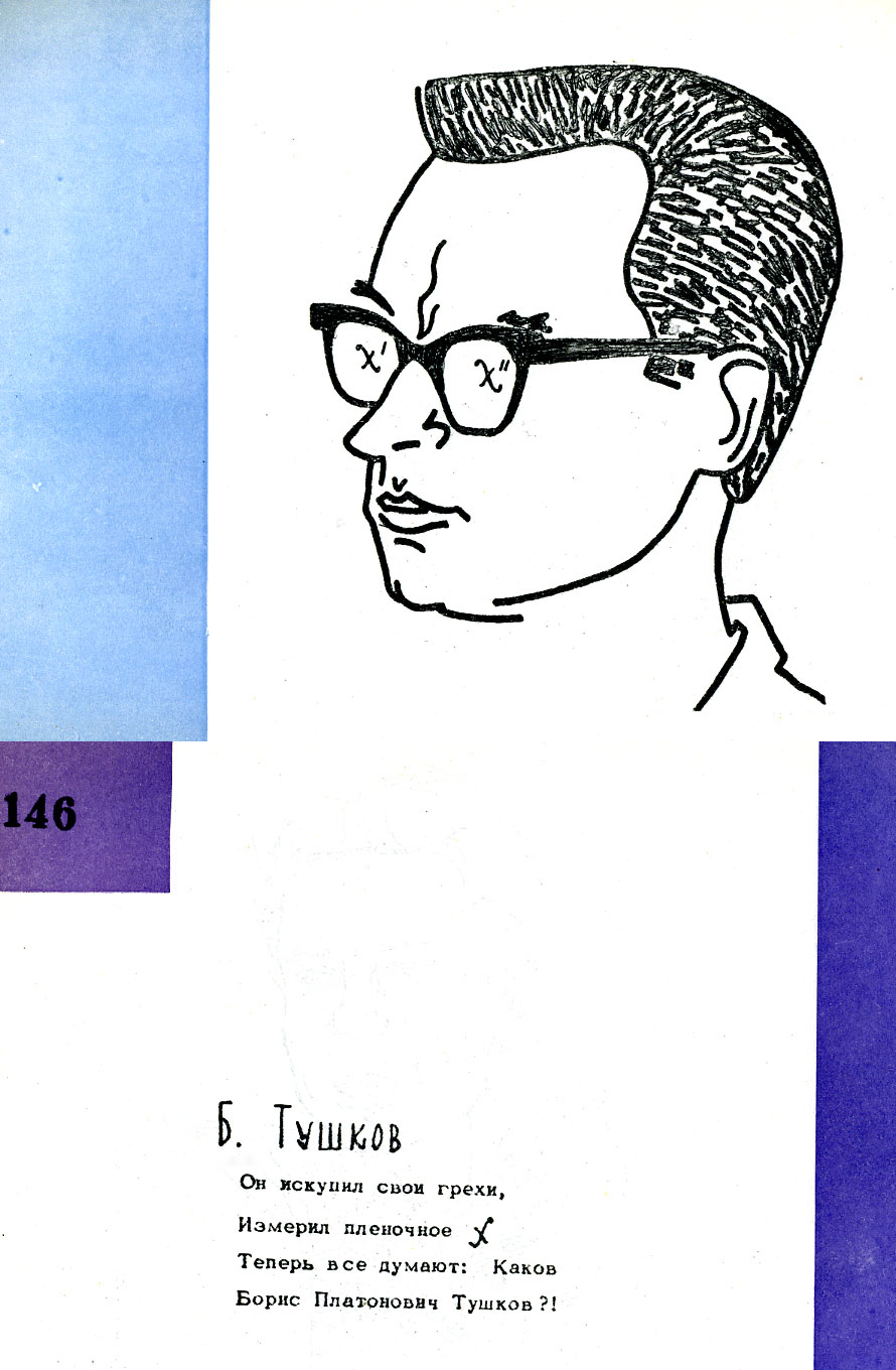 Дружеский шарж Тушкова Б.П. из книги "Музей друзей", изданной научными сотрудниками Института физики Сибирского отделения Академии наук СССР (ИФ СО АН СССР) Олегом Артемьевичем Баюковым и Николаем Сергеевичем Чистяковым. Удивительная книжка дружеских шаржей и эпиграмм на сотрудников Института физики СО АН СССР. Она вышла в 1967 году к 10-летию начала работы института. Вышла небольшим тиражом в 100 экземпляров и распространялась строго по списку, лично в руки. Узнать себя на страницах книги смогли 48 самых ярких и заметных личностей молодого института. Позже (в 1971 году) вышла вторая книга под таким же названием. Что побудило их взяться за такой труд, авторы подробно изложили в предисловии к первой и второй книгам. Книги размещены на сайте.