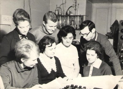 1963 год. На снимке студенты радиофизического факультета Томского государственного университета им. В.В. Куйбышева перед защитой дипломов, будущие сотрудники Красноярского Института физики Сибирского отделения Академии наук СССР (ИФ СО АН СССР).