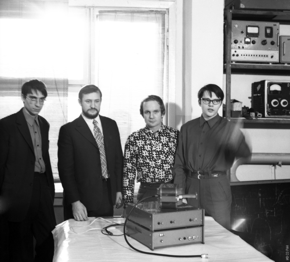 1973 год. Группа В. М. Владимирова, младшего научного сотрудника лаборатории радиоспектроскопии Института физики им. Л.В. Киренского Сибирского отделения Академии наук СССР (ИФ СО АН СССР). Под руководством Владимирова был разработан частотно-перестраиваемый фильтр на основе электронного парамагнитного резонанса для станции спутниковой связи. Прибор изготовлен в экспериментальных механических мастерских института. Фото на память в день сдачи прибора в эксплуатацию. Слева направо: Кармишин А. М., Владимиров В. М., Симонов А .А., Зайцев В. Г. Красноярск.