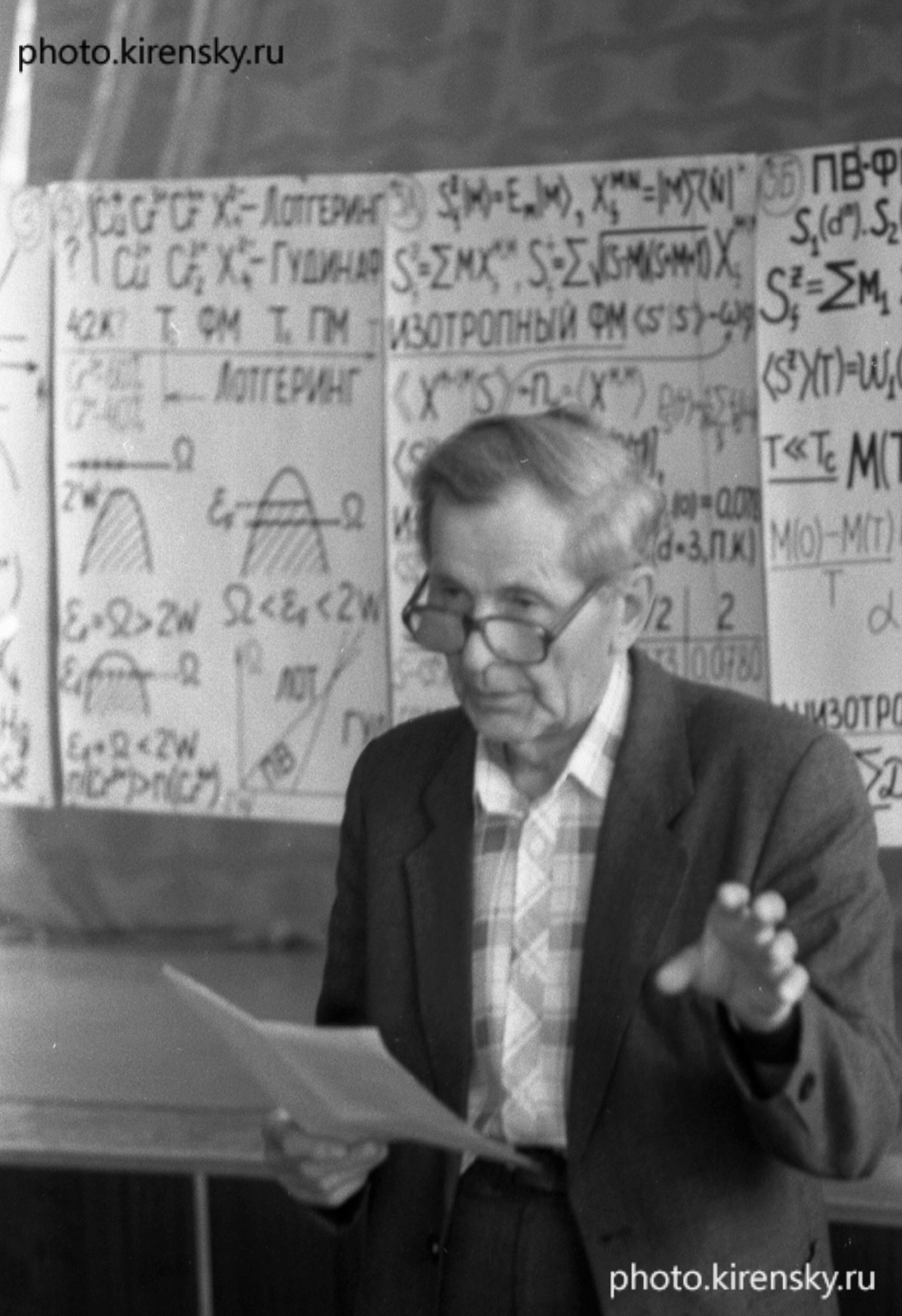 Эта фотография сделана летом 1967 года во дворе Института физики Сибирского отделения Академии наук СССР (пр. К.Маркса, 42) после одного из городских семинаров по магнетизму. На ней представлена только часть учеников и соратников академика Л. В. Киренского. На фотографии отсутствуют, по крайней мере, еще около двух десятков человек не оказавшихся в Красноярске в этот день, а также живущих и успешно работающих в других городах страны: Иркутске, Улан-Уде, Петропавловске, Южно-Сахалинске, Абакане, Енисейске. Верхний ряд, слева направо: Ю.Д. Тропин, А.Г.Звегинцев, З.Н. Краснов, И.В. Антонов, Н.М. Саланский, В.С. Прокопенко, П.С. Галепов, Н.П. Пак. Средний ряд, слева направо: Ю.В. Захаров, Р.П. Смолин, Г.М. Родичев, С.В. Кан, В.Г. Пынько, Б.А. Аюрзанайн, И.П. Антипин, Т.П. Изотова, В.И. Синегубов, Н. А. Корнев, Н.С. Чистяков, В.П. Рябинин, Р.Е. Ершов, Л.И. Слободской. Сидят (слева направо): П.С. Сарапкин, Н.С. Черкашин, В.С. Афошин, А.Г. Лундин, А.Я. Власов, Л.В. Киренский, А.И. Дрокин, Н.И. Втюрин, Н.В. Решетникова. Красноярск.