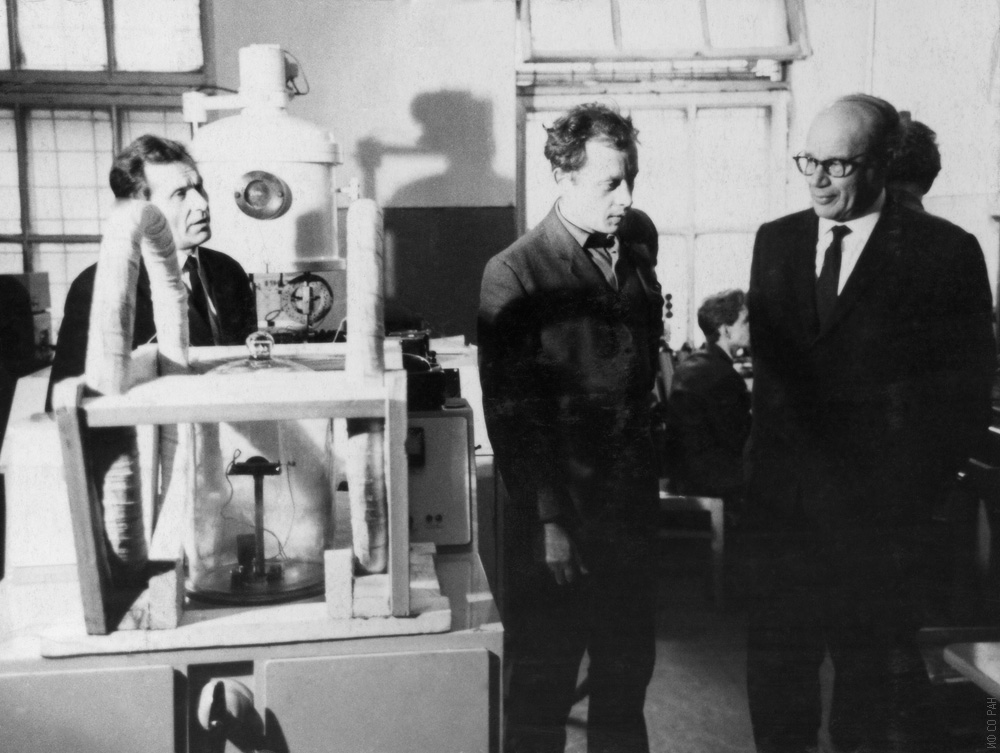 Слева направо: А.Я. Власов, А.Г. Звегинцев и профессор Е.И. Кондорский в лаборатории магнетизма горных пород и геофизики Института физики Сибирского отделения Академии наук СССР (ИФ СО АН СССР) обсуждают вопросы, связанные с изучением пленок окислов железа, 1967 год. Красноярск.