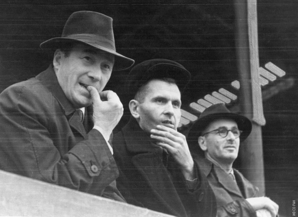 Л.В. Киренский, директор Института физики Сибирского отделения Академии наук СССР (слева) и А.Я. Власов, его заместитель по научной работе, на Красноярском стадионе «Локомотив» во время футбольного матча. Снимок 1957 года.