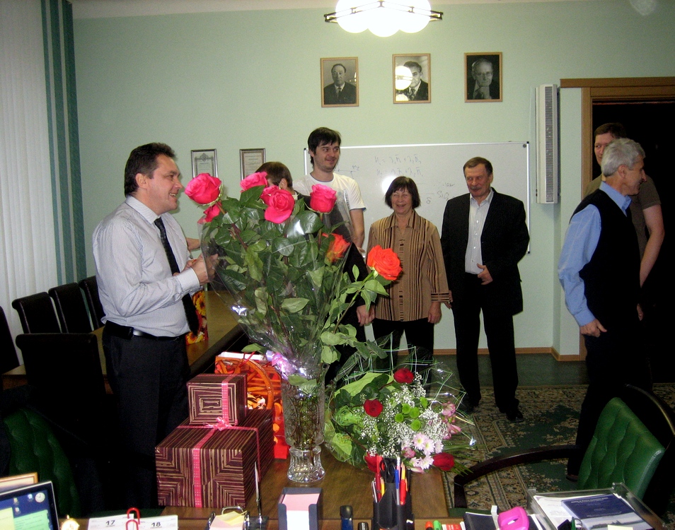 18 ноября 2011 года. Исполняющему обязанности директора Института физики им. Л.В. Киренского Сибирского отделения Российской академии наук (ИФ СО РАН) Волкову Н.В. исполнилось 50 лет. Юбиляра поздравляют сотрудники института. Фото на память. Сидит: Петраковский Г. А. В первом ряду слева направо: Дрокина Т. В., Степанов Г. Н., Панкрац А. И., Бондарева Е. В., Волков Н. В., Абрамова Г. М., Романова О. Б. Во втором ряду слева направо: Тугаринов В. И., Великанов Д. А., Удод Л. В., Саклакова Н. П. Красноярск.