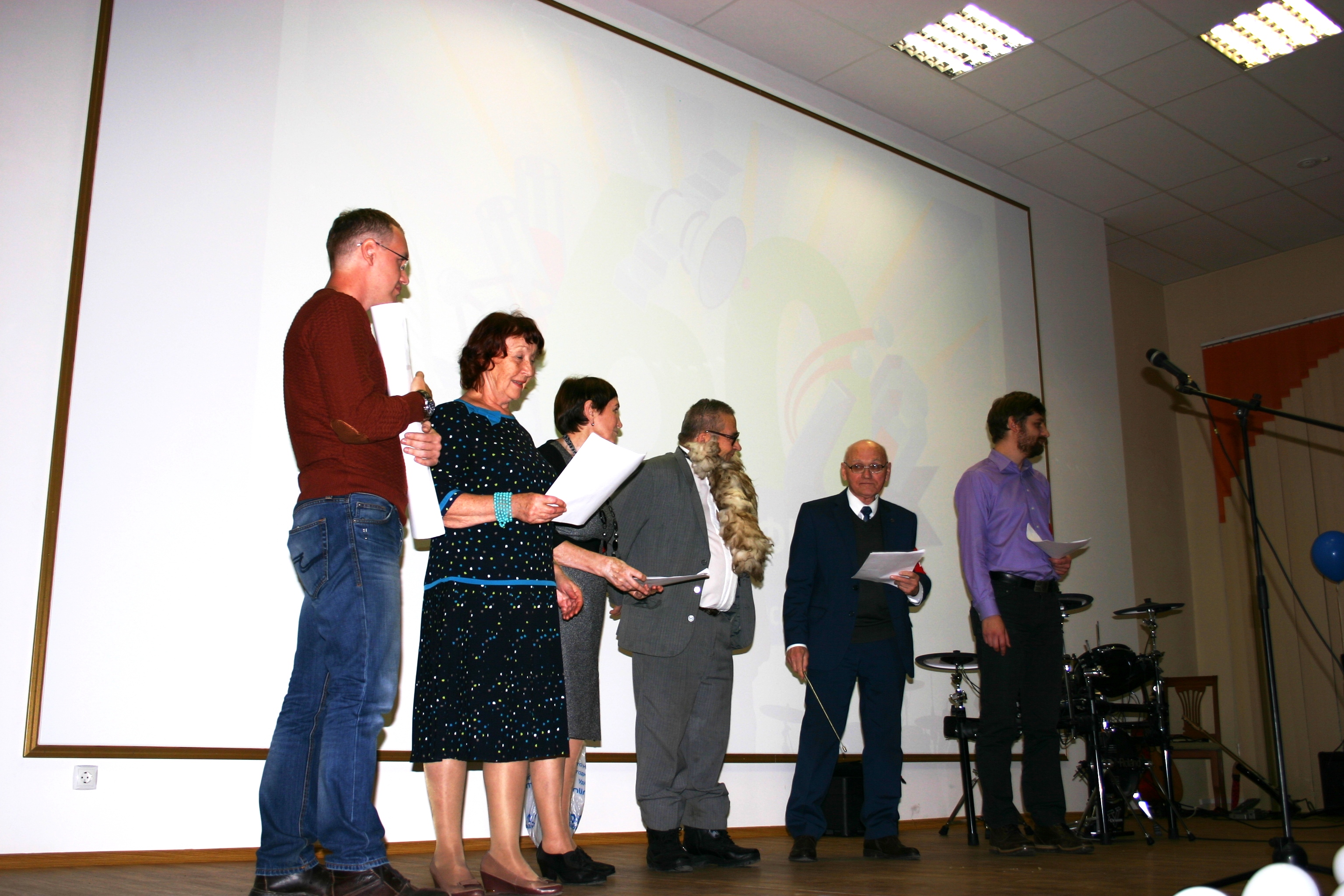 12 октября 2016 года. На празднике в честь 60-летия Института физики им. Л.В. Киренского Сибирского отделения Российской академии наук (ИФ СО РАН). Участники художественной самодеятельности лаборатории кристаллофизики (слева направо): Богданов Е.В., Мельникова С.В., Бовина А.Ф., Воронов В.Н., Флеров И.Н., Павловский М.С. Красноярск.
