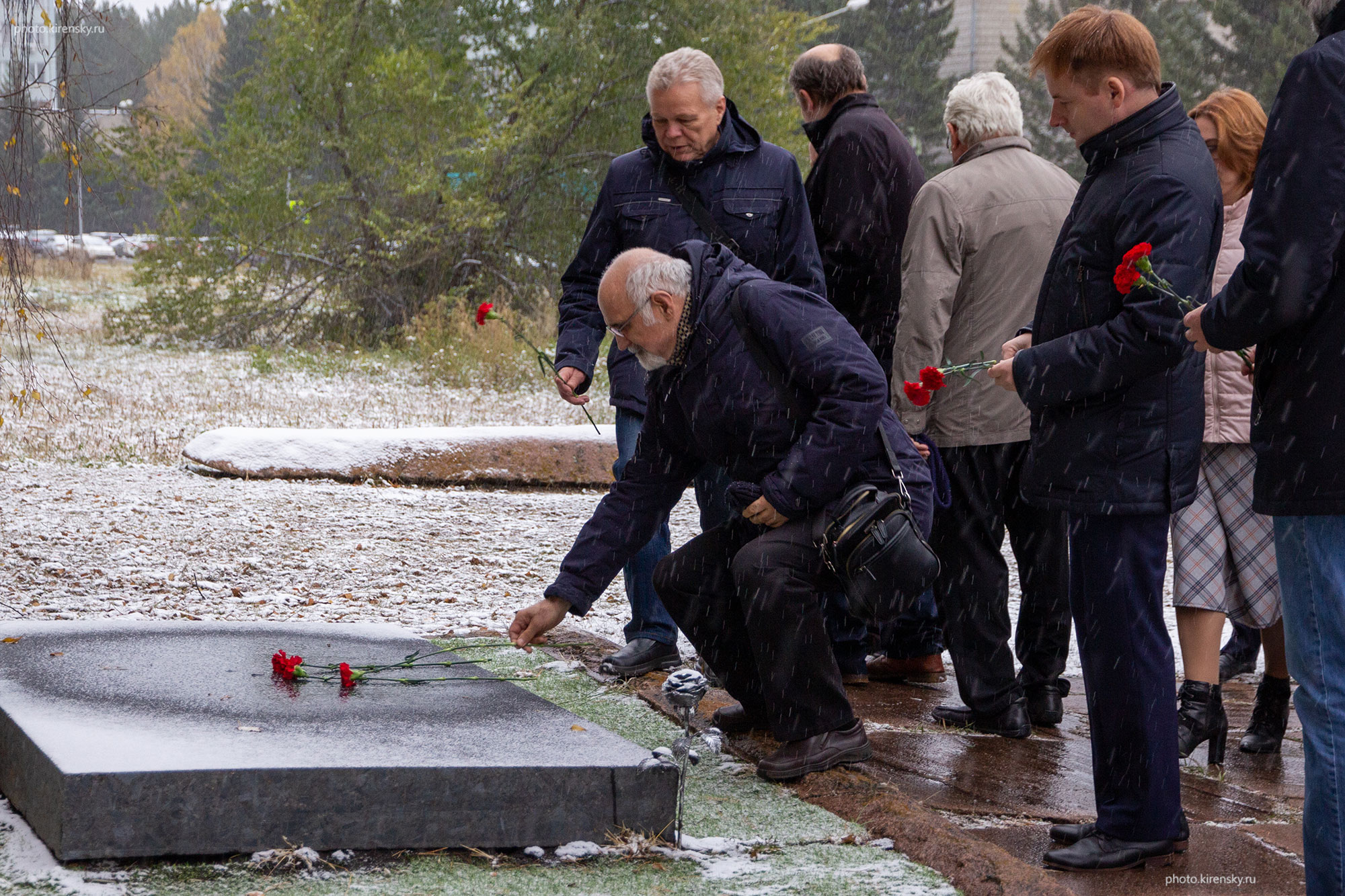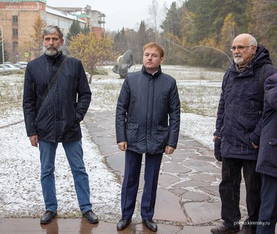 7 апреля 2018 года. «…Не зарастет народная тропа…». Возложение цветов на могиле академика Леонида Васильевича Киренского в день рождения после окончания традиционных научных чтений его памяти. Красноярск. Академгородок. Цветы возлагает Архипкин Василий Григорьевич, заведующий лабораторией когерентной оптики, справа от него Зырянов Виктор Яковлевич, заведующий лабораторией молекулярной спектроскопии, слева - Вьюношев Андрей Михайлович, заместитель директора Института физики по научной работе.