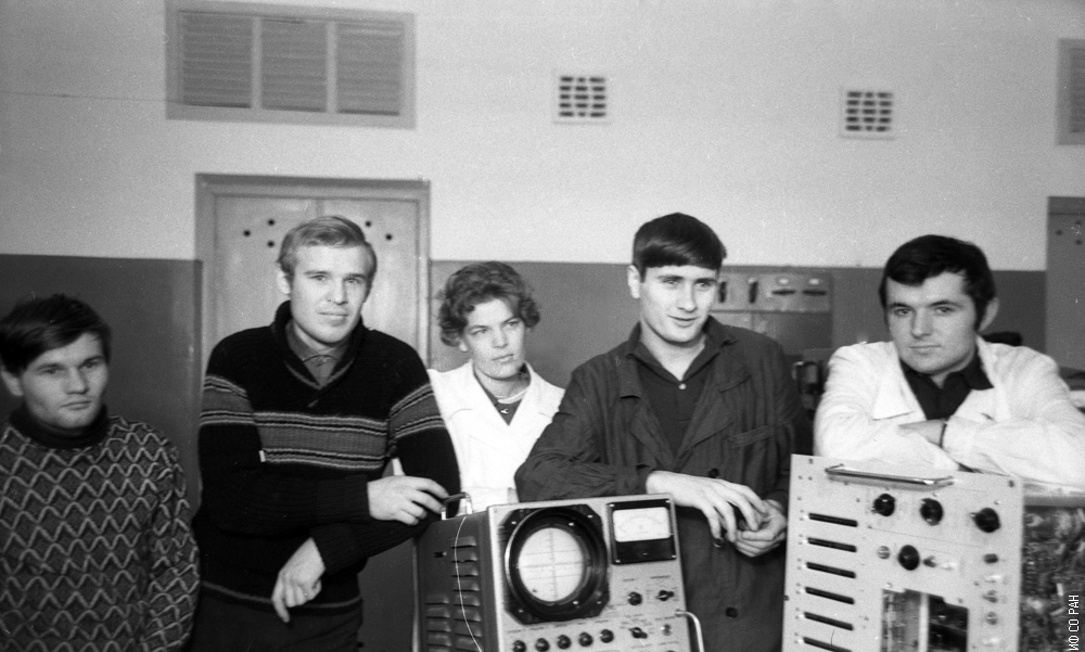 Сотрудники бюро измерительных приборов (бюро БИП) Института физики Сибирского отделения Академии наук СССР (ИФ СО АН СССР), слева направо: лаборант Жавнерчик Александр Донатович, инженер Раньшиков Виктор Петрович, инженер Яницкая Галина Викторовна, инженер Шевченко Анатолий Сергеевич, инженер Михальский Виктор Игнатьевич, фото 1969 года.