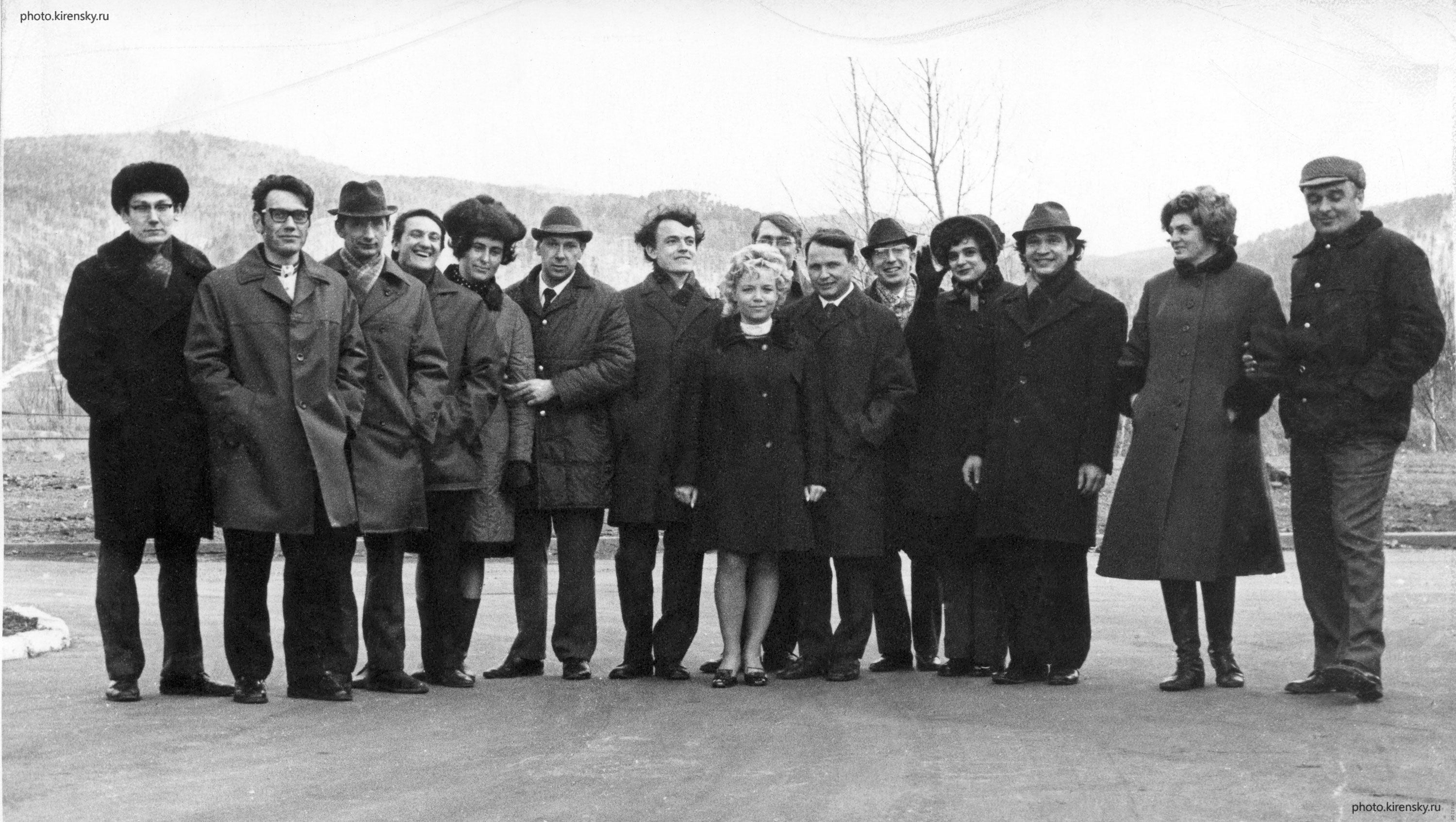 1980 год. Снимок сделан в Академгородке Красноярска. Сотрудники лаборатории теории функций Института физики им. Л.В. Киренского Сибирского отделения АН СССР (СО АН СССР с 1991 года - СО РАН) и гости института, слева направо: Аронов А.М., Трутнев В.М., Маергойз Л.С., Горенский Н.Ю., Зиновьева Э.Ф. (супруга Зиновьева), Зиновьев Б.С., Цих А.К., супруга Циха, Кытманов А.М., Южаков А.П., Кривоколеско В.П., супруга Кривоколеко, Даутов Ш.А., Айзенберг Т. В. (супруга Айзенберга), Айзенберг Л.А.