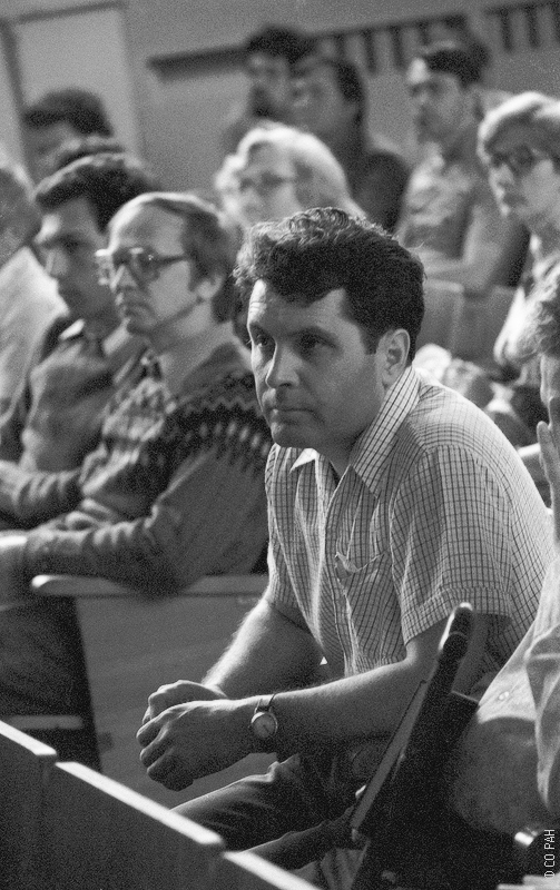 Захаров Юрий Владимирович (на переднем плане), справа от него Фалалеев Олег Владимирович, за ним - Саблина Клара Александровна, сотрудники Института физики им. Л.В. Киренского Сибирского отделения Академии наук СССР, на Всесоюзной конференции по аморфному магнетизму, организованной и проведенной Институтом физики в 1986 году в Дивногорске (Красноярский край)