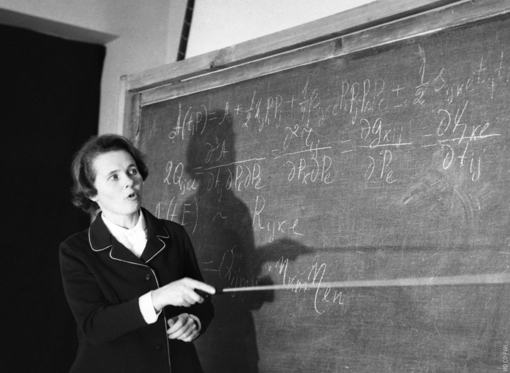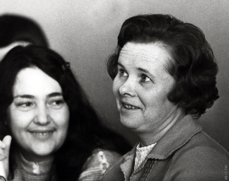 На снимке научные сотрудники лаборатории кристаллофизики Института физики им. Л.В. Киренского Сибирского отделения Академии наук СССР (СО АН СССР с 1991 года - СО РАН) Александрова И.П. (слева) и Зайцева М.П. в конференц-зале на обще институтском философском семинаре. Снимок 1972 года. Красноярск.