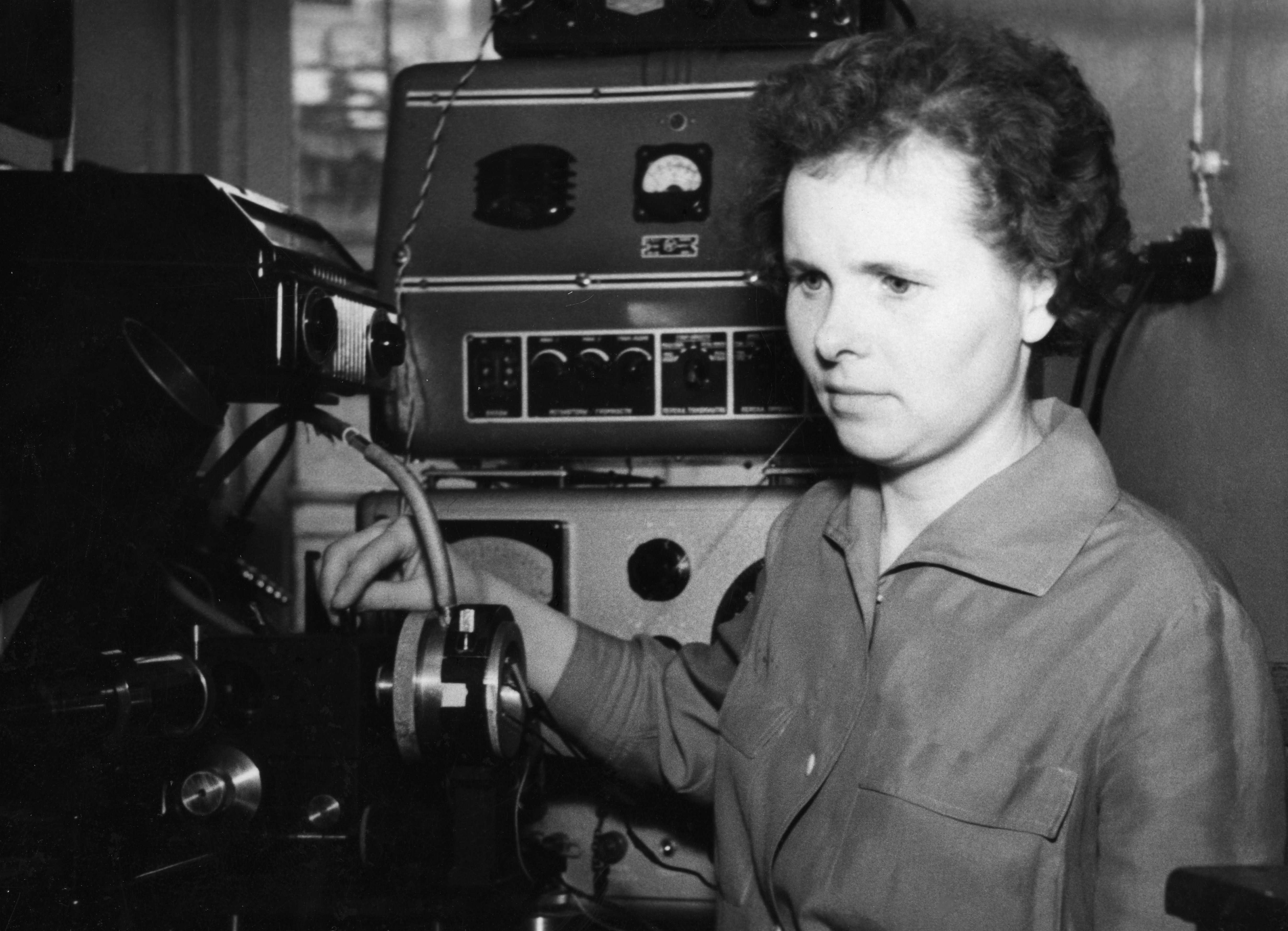 Зайцева Мария Пантелеймоновна, младший научный сотрудник лаборатории кристаллофизики Института физики им. Л.В. Киренского Сибирского отделения Академии наук СССР (ИФ СО АН СССР), у установки для изучения пьезоэффекта и электрострикции сегнетоэлектриков путем определения малых переменных деформаций методом модуляционной интерферометрии. Фото 1962 года. Красноярск.