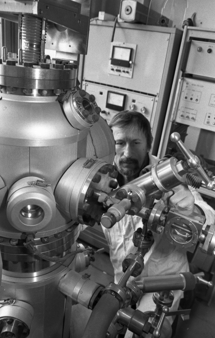 Жигалов Виктор Степанович, старший научный сотрудник сектора физики неоднородных сплавов Института физики им. Л.В. Киренского Сибирского отделения Академии наук СССР (ИФ СО АН СССР), за работой на высоковакуумной установке импульсно-плазменного напыления тонких магнитных пленок, фото 1988 года. Красноярск.