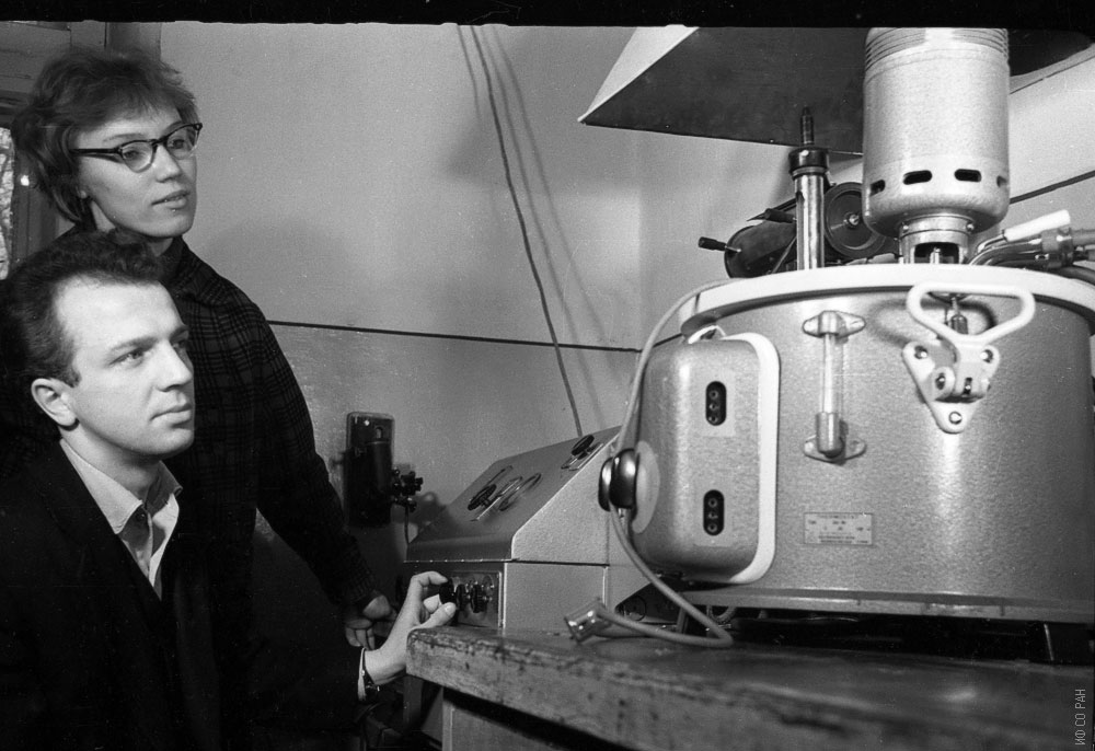 Кинд В.В. и Звегинцева Л.Н., сотрудники лаборатории молекулярной спектроскопии Института физики Сибирского отделения Академии наук СССР (ИФ СО АН СССР), фото 1964 года.