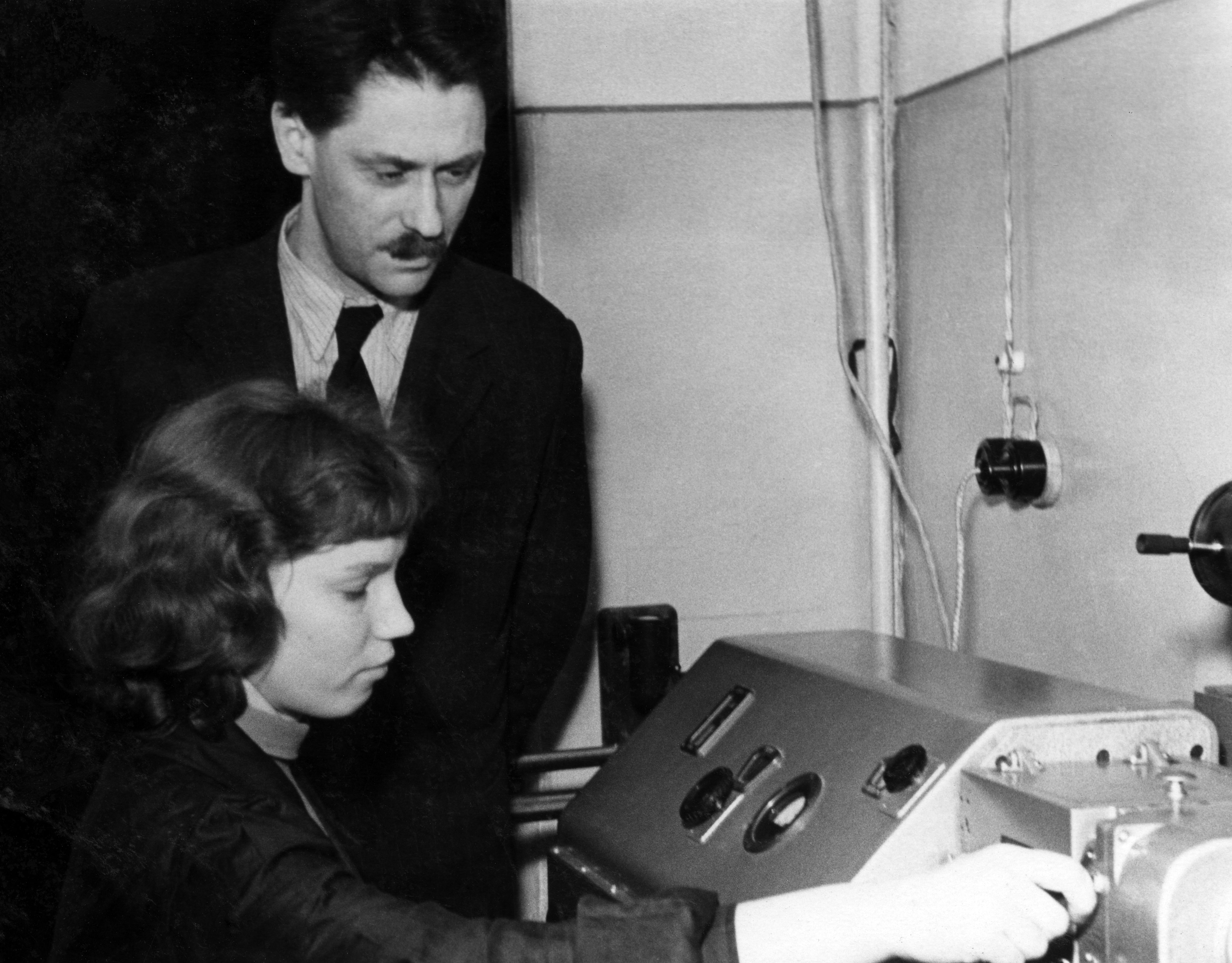 Кинд В. В. и Звегинцева Л. Н., сотрудники лаборатории молекулярной спектроскопии Института физики Сибирского отделения Академии наук СССР (ИФ СО АН СССР), у установки по исследованию оптических спектров, фото 1965 года. Красноярск.