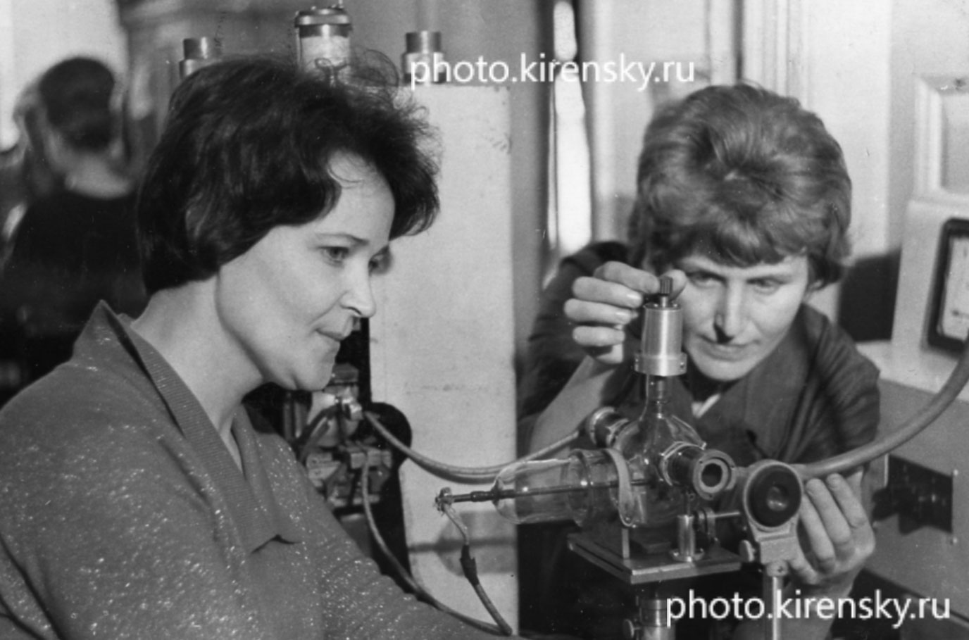 1967 год. Т.Ф. Зыкова и А.П. Устимец, сотрудники лаборатории эмиссионной спектроскопии Института физики Сибирского отделения Академии наук СССР (ИФ СО АН СССР), за установкой по исследованию состава поверхностных пленок методом спектрального анализа. Красноярск.