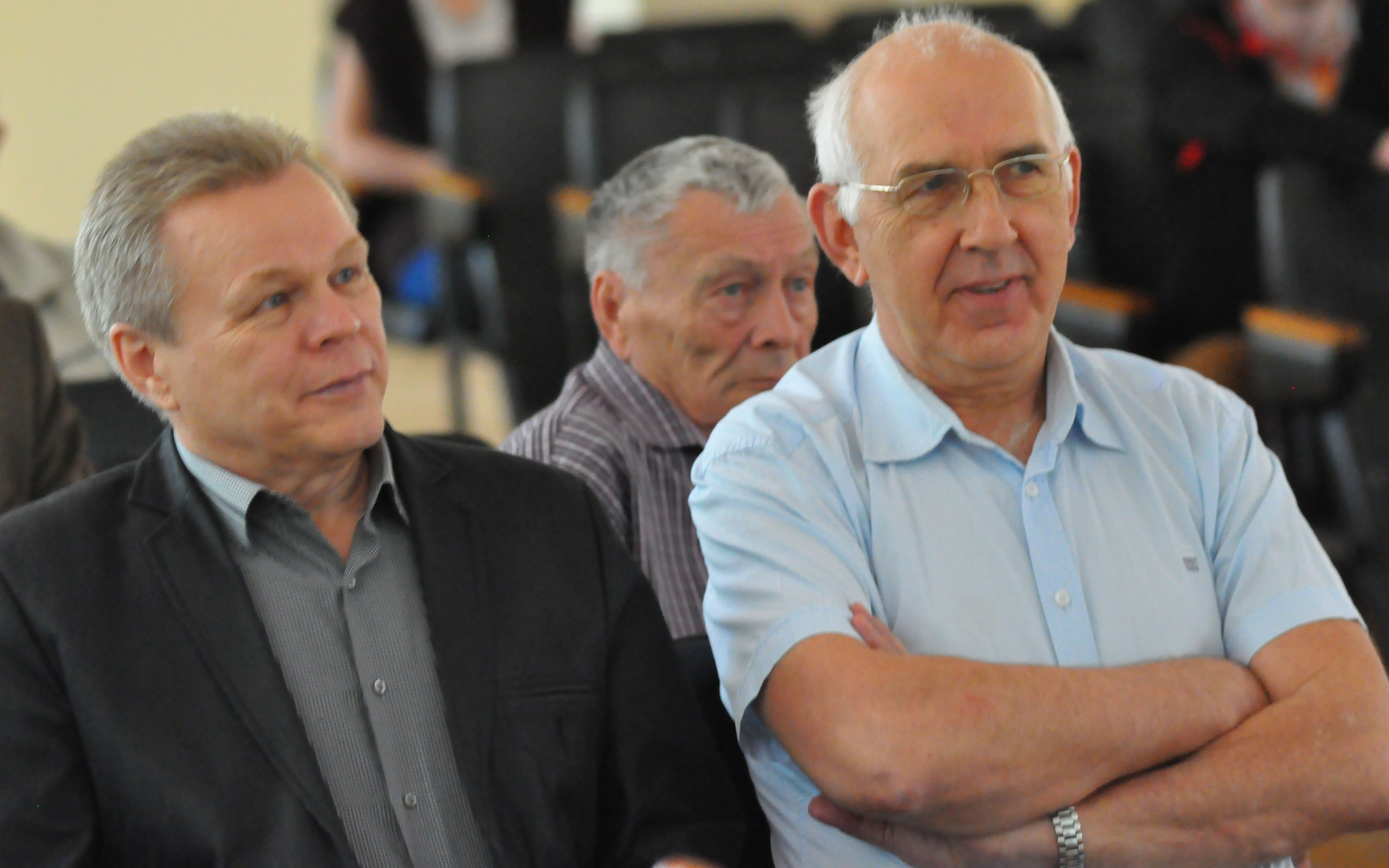 2015 год, 29 мая. На заседании ученого Совета Института физики им. Л.В. Киренского Сибирского отделения Российской академии наук (ИФ СО РАН). В первом ряду: В.Я. Зырянов (слева) и С.Г. Овчинников, заместители директора по научной работе института, во втором ряду - В.И. Зиненко, профессор, главный научный сотрудник лаборатории кристаллофизики института. Красноярск.