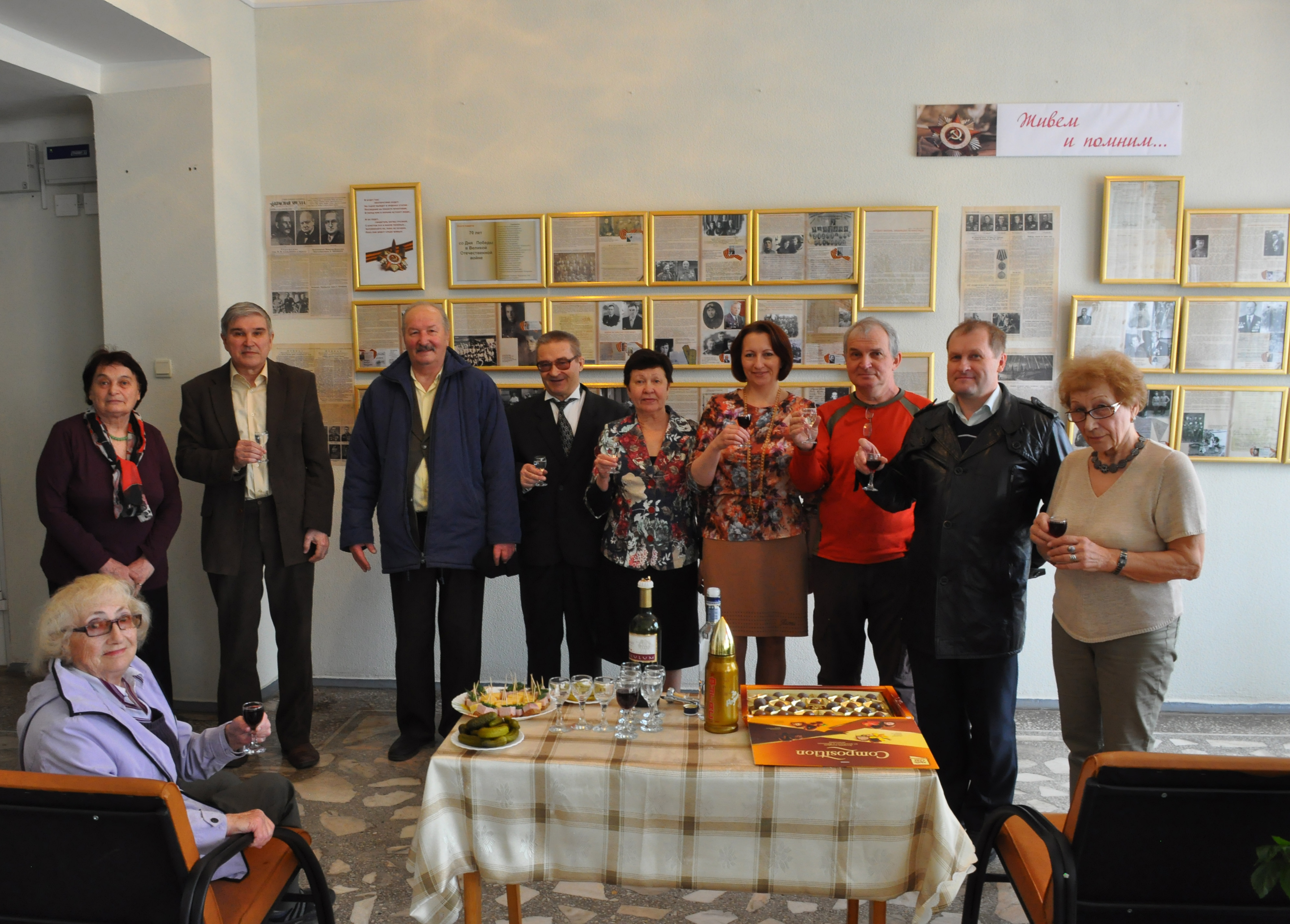 8 мая 2015 года. У стенда «Живем и помним…». Открытие стенда в холле Института физики им. Л.В. Киренского Сибирского отделения Российской академии наук (ИФ СО РАН), посвященного родителям и родственникам сотрудников института - воинам Великой отечественной войны 1941-1945 гг. Слева направо: Саблина К.А., Чеканова Л.А., Тюрнев В.В. , Бондаренко Г.В., Воронов В.Н., Матыгулина М.М., Бондарева Е.В., Заблуда В.Н., Федоров А.С., Хрусталева Л.М. Красноярск.