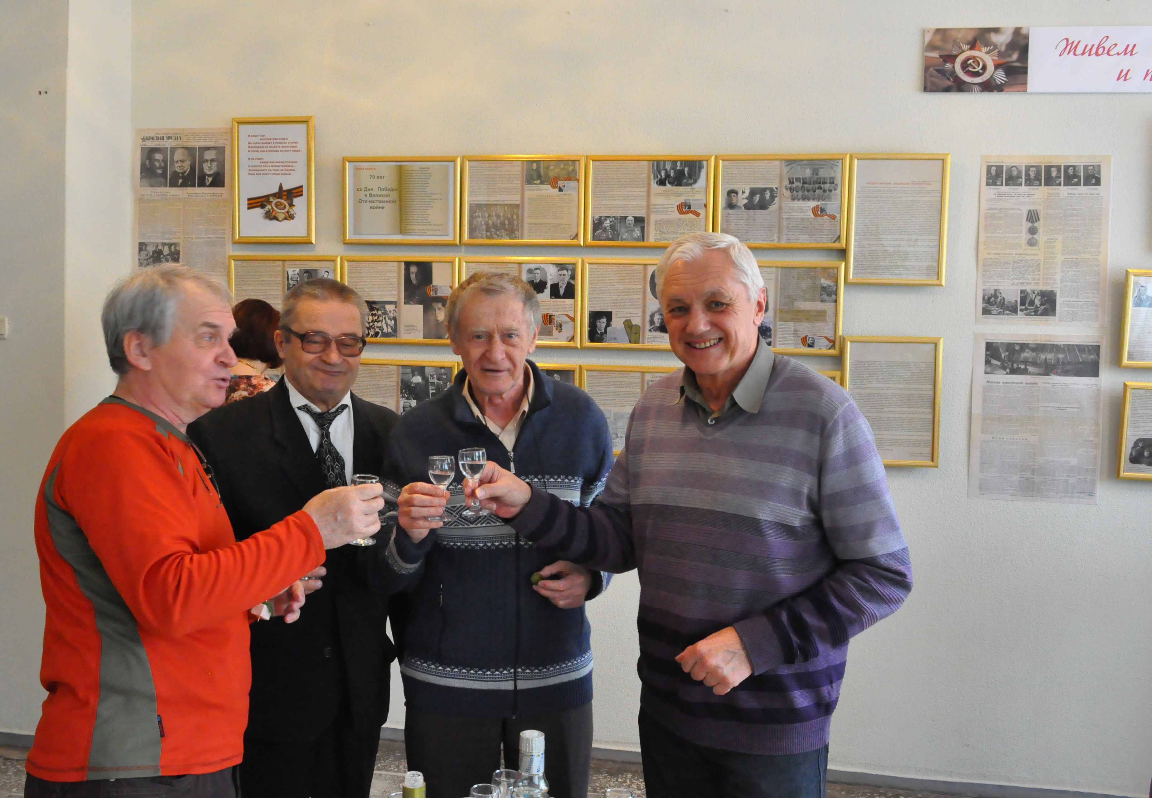 2015 год, 8 мая. У стенда «Живем и помним…» в холле Института физики им. Л.В. Киренского Сибирского отделения Российской академии наук (ИФ СО РАН), посвященного родителям и родственникам сотрудников института - воинам Великой Отечественной войны 1941-1945 гг. к 70-ию Победы. Тост за Победу. Сотрудники Института физики, слева направо: В.Н. Заблуда, В.Н. Воронов, А.В. Малаховский, А.И. Панкрац. Красноярск.