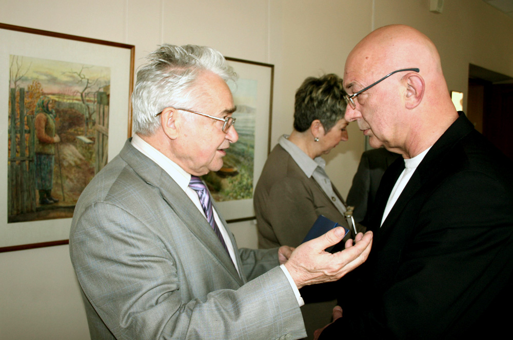 2012 год. Ректор Сибирского федерального университета (СФУ) академик Е. А. Ваганов (справа) и председатель Президиума Красноярского научного центра Сибирского отделения Российской академии наук (КНЦ СО РАН) академик В. Ф. Шабанов, на открытии памятного барельефа, посвященного академику Л.В. Киренскому в СФУ. Красноярск.