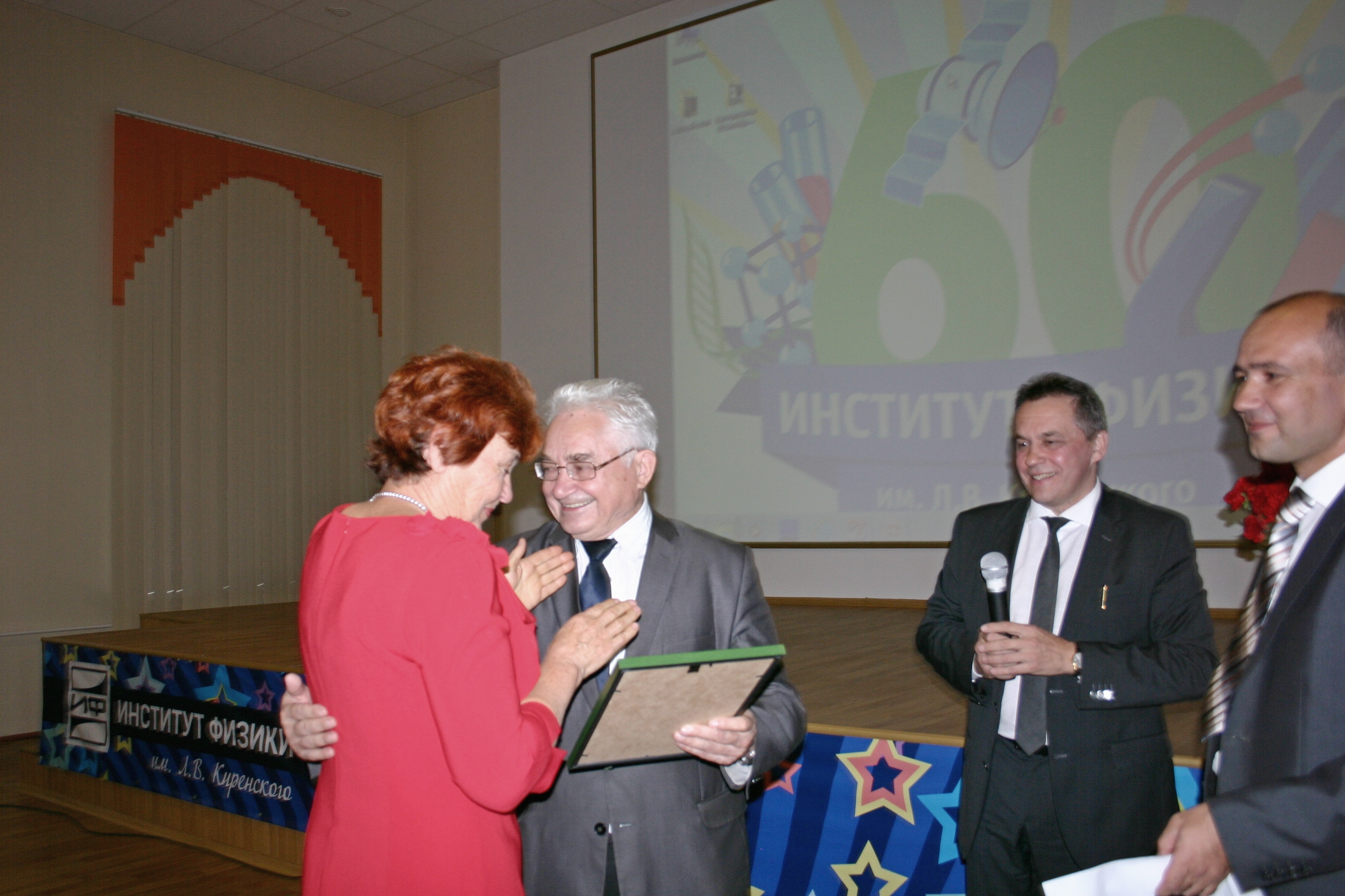 12 октября 2016 года в конференц-зале Института физики им. Л.В. Киренского Сибирского отделения Российской академии наук (ИФ СО РАН) проходило расширенное заседание ученого Совета, посвященное 60-летию образования института с участием сотрудников института, представителей администраций города и края, директоров предприятий-партнеров, директоров подразделений Федерального исследовательского центра "Красноярский научный центр Сибирского отделения Российской академии наук" (ФИЦ КНЦ СО РАН) и других гостей. Благодарственное письмо дирекции института вручается Галине Васильевне Шиян, ведущему инженеру по эксплуатации зданий. Слева направо: Г.В. Шиян, В.Ф. Шабанов, Н.В. Волков, С.И. Попков. Красноярск.