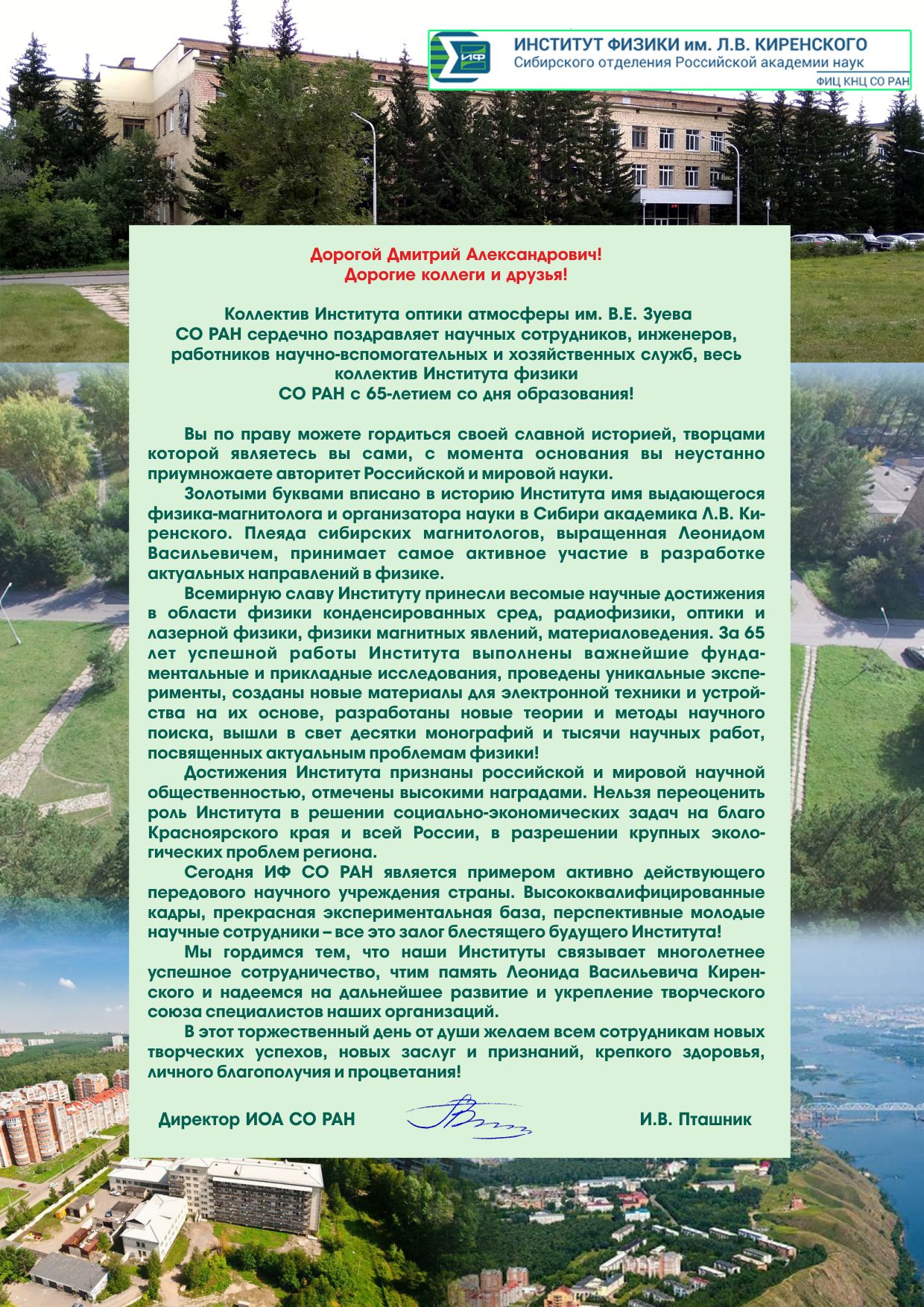 Поздравление от Института оптики и атмосферы СО РАН им. В.Е. Зуева