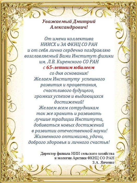 Поздравление от коллектива Института НИИ сельского хозяйства и экологии Арктики ФКНЦ СО РАН